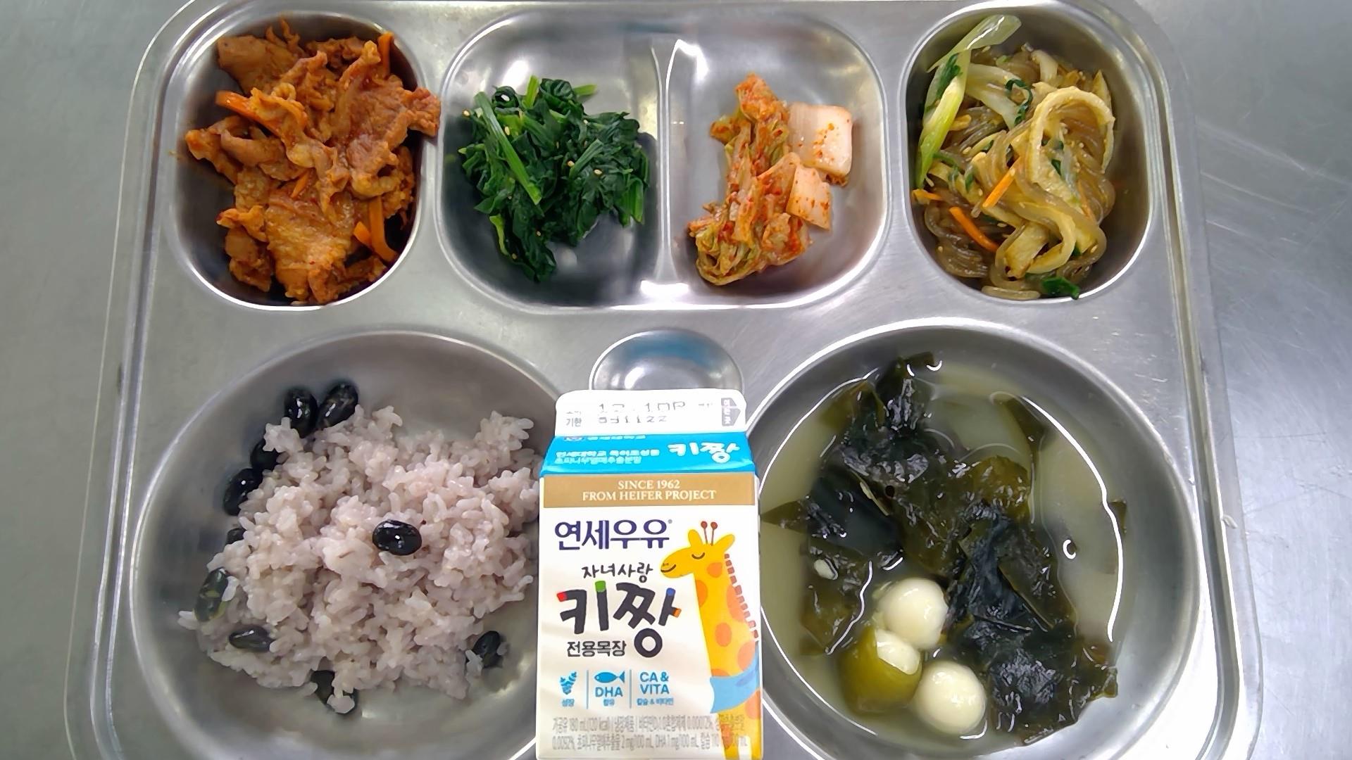 서리태콩밥(5)새알미역국(5.6.8.9.18): 염도 0.6%제육볶음(5.6.10.13)부추잡채(1.5.6.13)시금치나물무침(5.6)배추김치(9)우유(초)(2)* 에너지/단백질/칼슘/철653.15/32.64/191.07/3.60