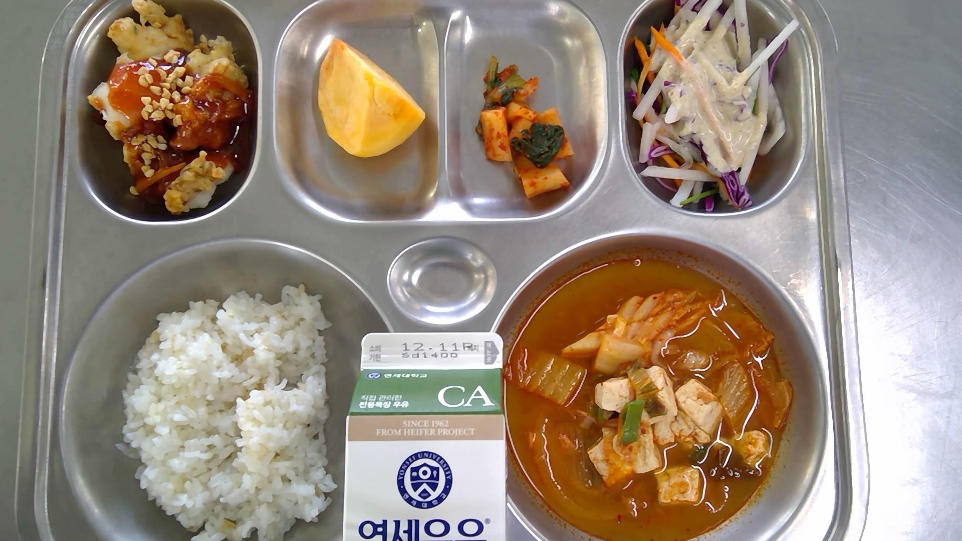 현미쌀밥참치김치찌개(5.8.9.13.18): 염도 0.6%순살닭강정(4.5.6.12.13.15)부추참깨소스무침(1.5.6.13)총각김치(9)단감우유(초)(2)* 에너지/단백질/칼슘/철633.22/37.04/176.09/2.59