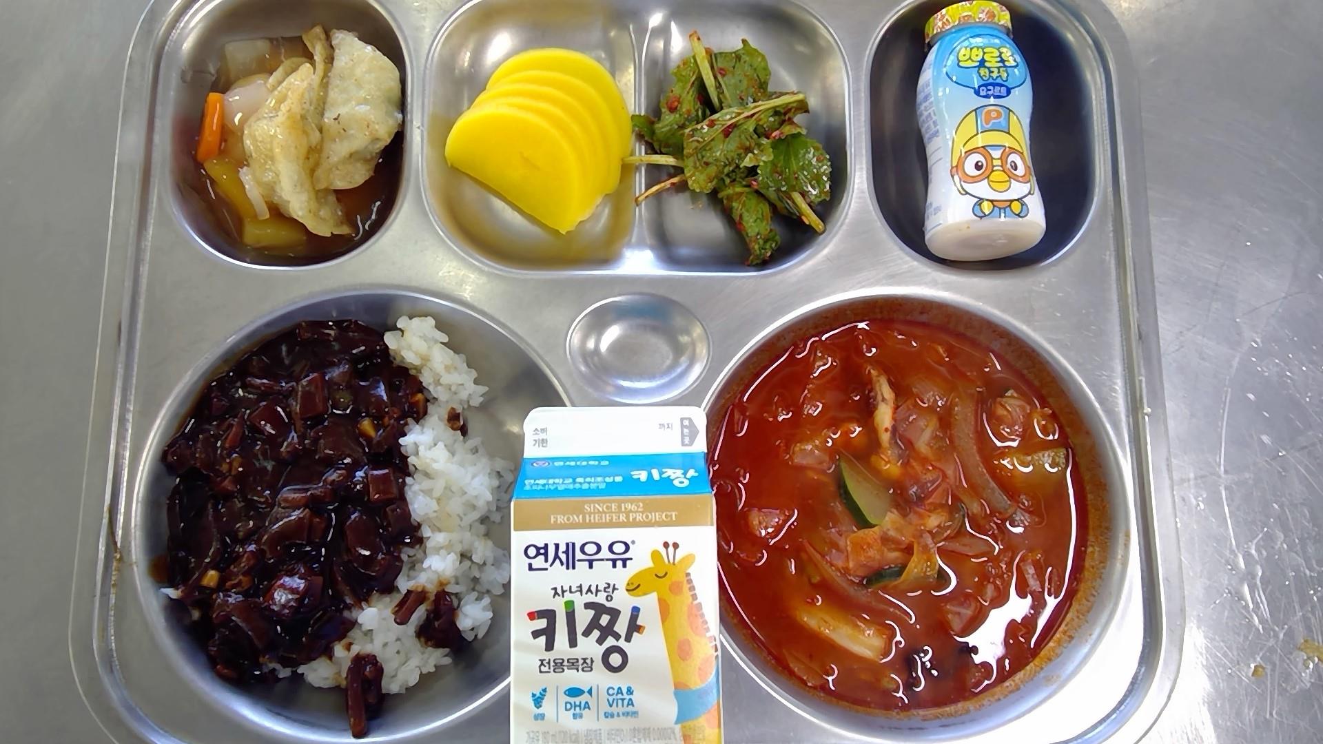 자장밥(5.6.10.13.16)삼선짬봉국/당면사리(6.8.9.13.17.18): 염도 0.6%후르츠만두탕수(1.5.6.10.11.12.13.15.16.18)유채겉절이(자율)(5.6.13)요구르트(2)단무지 / 우유(초)(2)* 에너지/단백질/칼슘/철641.79/22.07/246.68/4.47