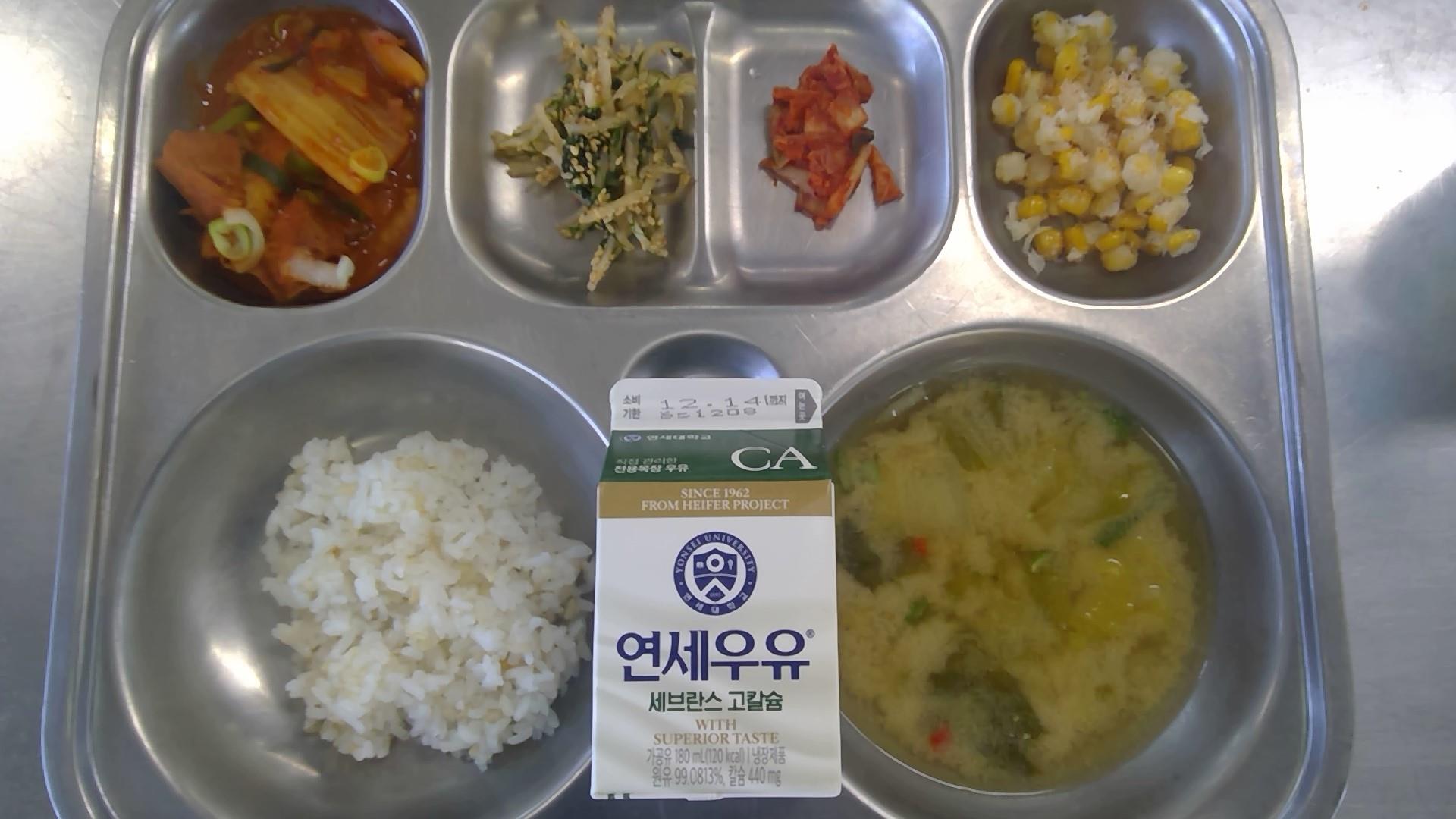 현미쌀밥시락국(5.6.8.9.18): 염도 0.6%묵은지돼지찜(5.6.9.10.13)옥수수콘튀김(2.13)파래무생채(초)(5.6.13)배추김치(9)우유(초)(2)* 에너지/단백질/칼슘/철496.73/21.57/250.54/2.19
