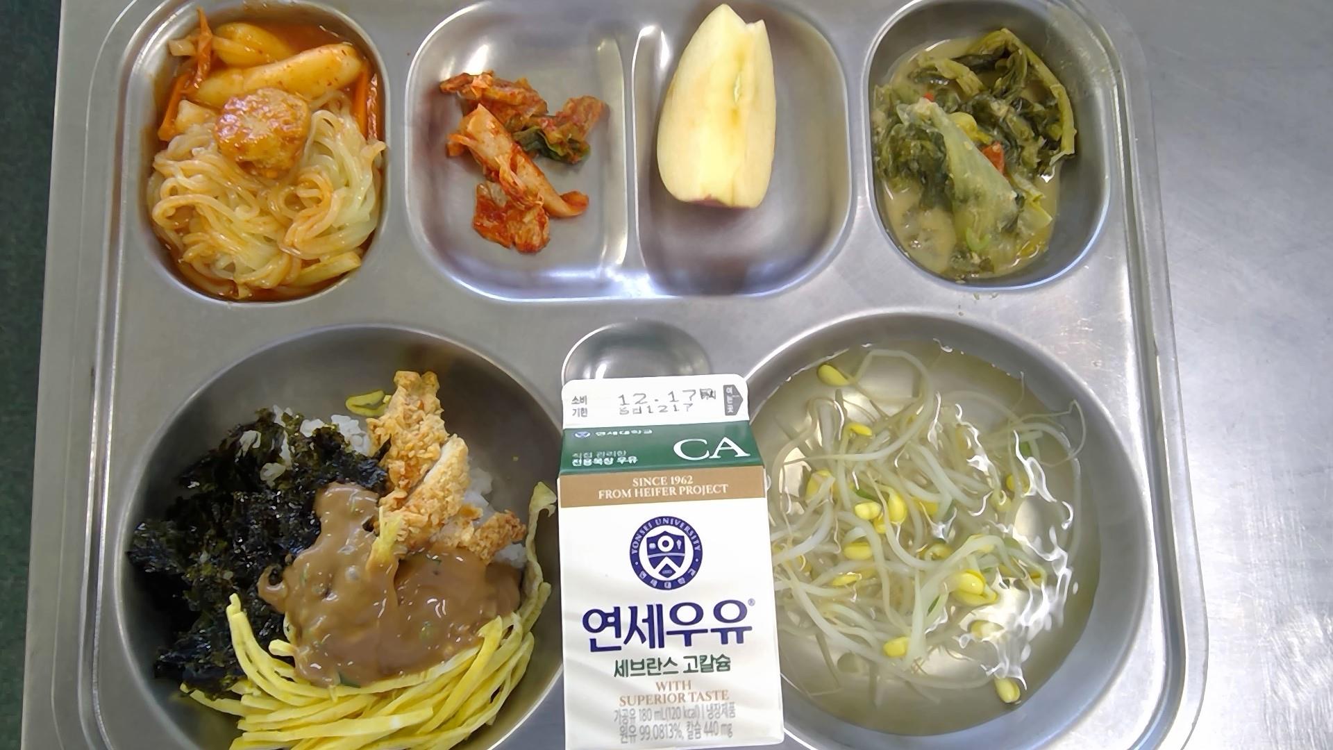 치킨마요덮밥(1.5.6.13.15)맑은콩나물국(5.6.8.9.18): 염도 0.6%쫄볶이(1.2.5.6.9.13.18)시래기된장조림(자율)(5.6.8.9.13.18)배추김치(9)사과(부사)우유(초)(2)* 에너지/단백질/칼슘/철748.18/34.00/219.68/3.04