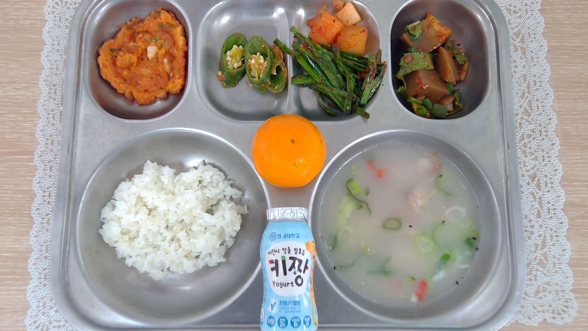 돼지국밥/수육(5.6.9.10): 염도 0.6%김치전(1.6.9.17)도토리묵무침(자율)(5.6.13)부추겉절이(5.6.13)아삭고추된장무침(1.5.6.13)깍두기(9)귤우유(초)(2)* 에너지/단백질/칼슘/철582.40/30.19/161.09/4.36