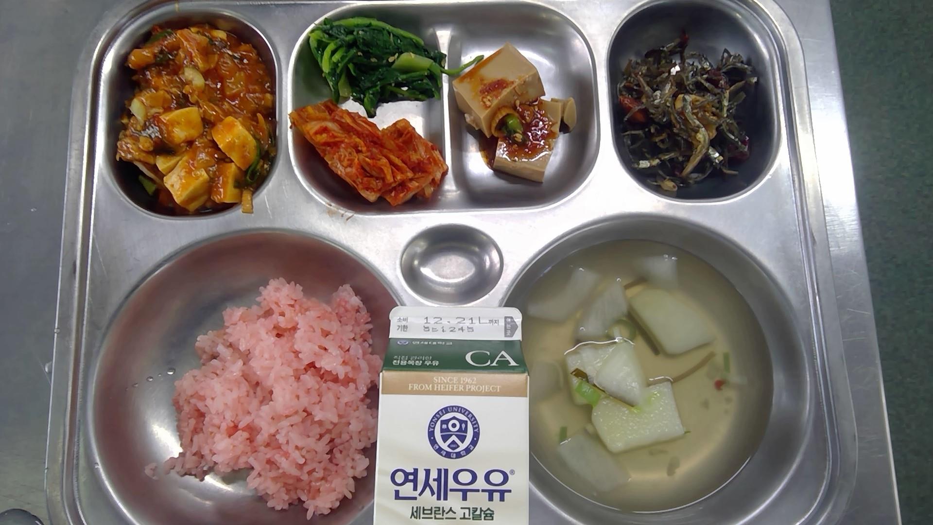 홍국쌀밥감자국(8.9.18): 염도 0.6%마파두부(5.6.10.12.13.18)견과류멸치볶음(2.4.13.14.19)봄동나물무침(자율)(5.6)배추김치(9)우유(초)(2)* 에너지/단백질/칼슘/철602.47/24.66/218.06/2.97
