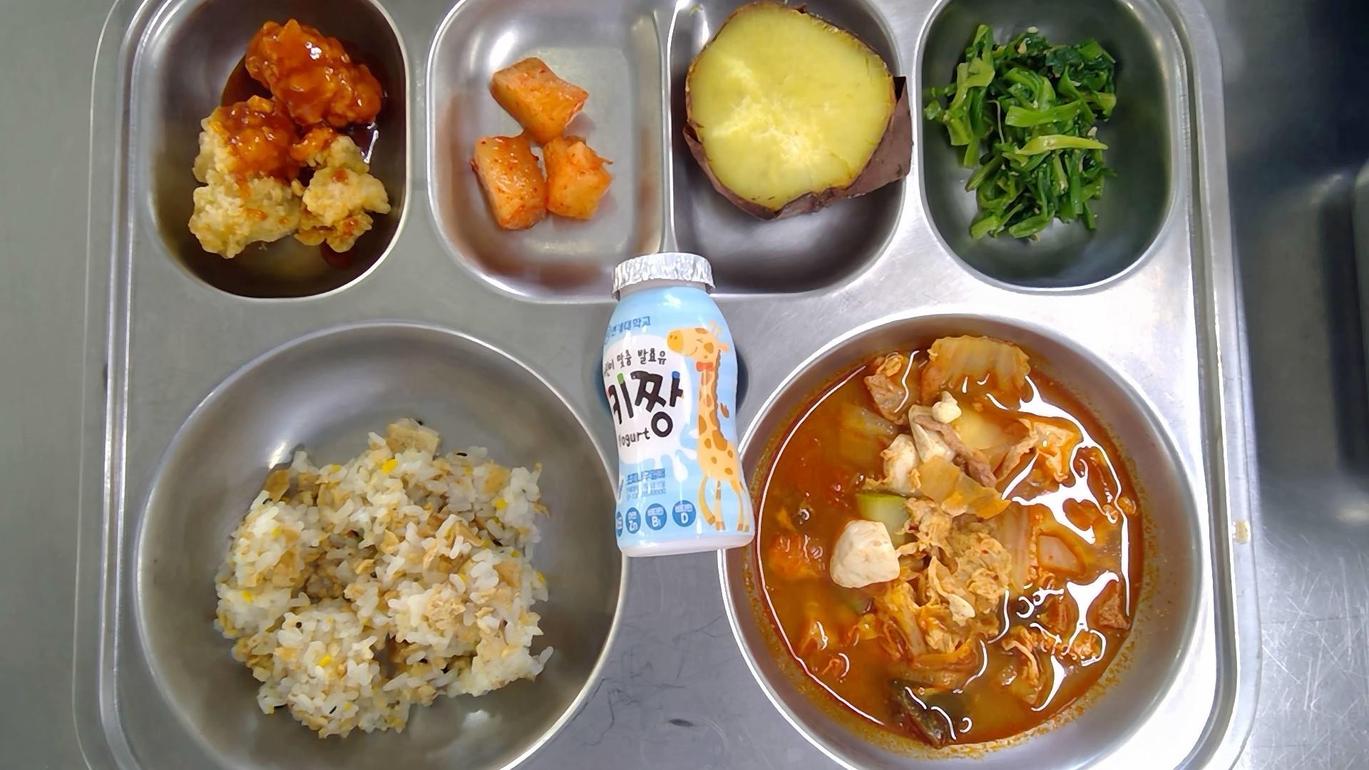 유부비빔밥(1.2.5.6.9.13.16.18)순두부찌개(1.5.8.9.10.13.18): 염도 0.6%대구살강정(5.6.12.13)미나리나물무침(5.6)깍두기(자율)(9)군고구마(초)우유(초)(2)* 에너지/단백질/칼슘/철742.67/36.77/420.00/4.19