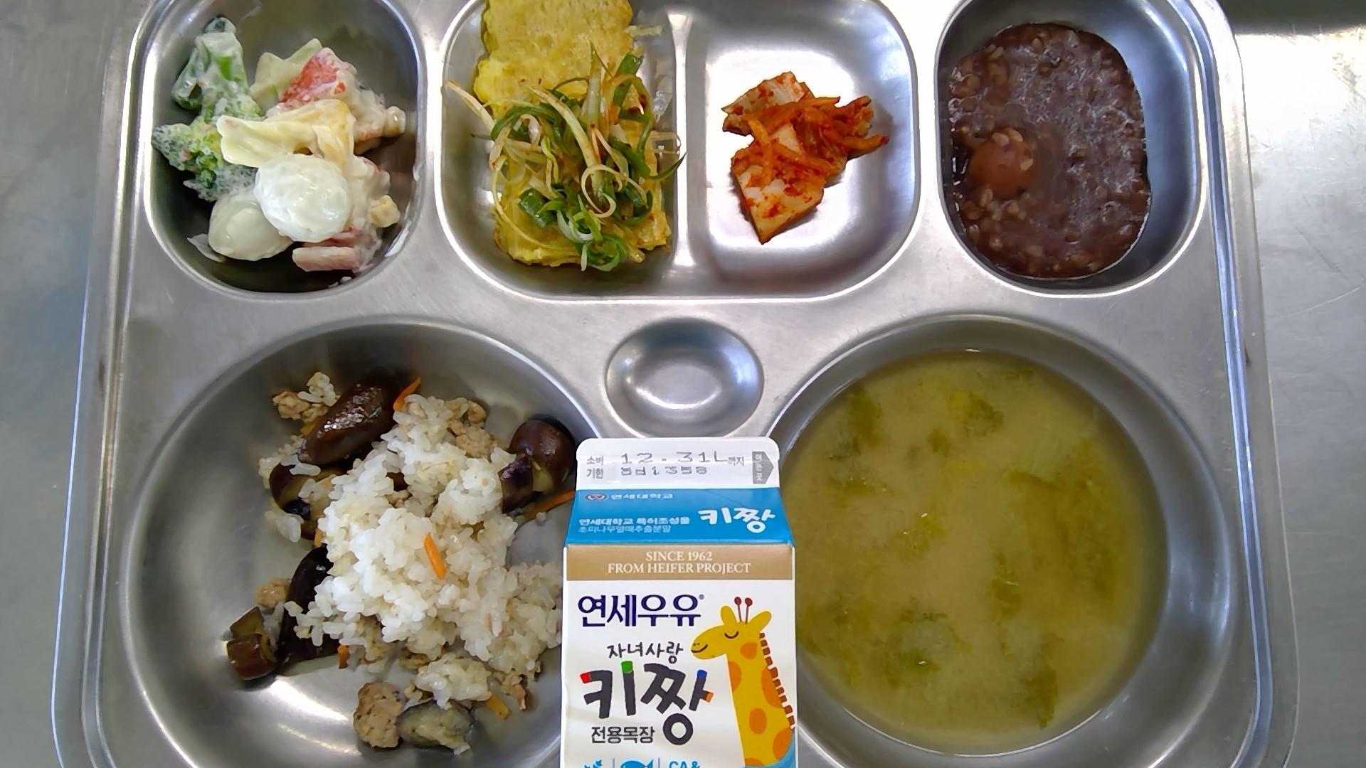 가지밥/양념장(5.6.10)시락국(5.6.8.9.18): 염도 0.6%어묵전/파채겉절이(1.5.6.13)꽃맛살샐러드(1.5.6.8.13.18)배추김치(9)동지팥죽(13)우유(초)(2)* 에너지/단백질/칼슘/철675.22/31.36/334.62/3.90