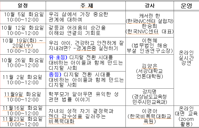 경상남도교육청에서는 안전하고 건강한 삶을 돕는 학부모 성교육을 다음과 같이 개설하여 운영하오니, 참여를 원하는 학부모님은 신청하시기 바랍니다.