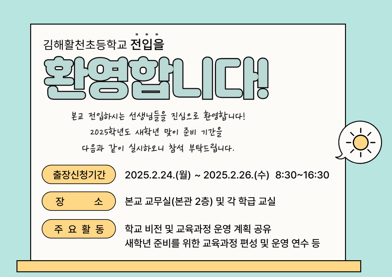 본교에 부임하시는 선생님을 환영합니다. 2025학년도 새 학년 맞이「교육과정 함께 세움 주간」을 다음과 같이 실시하오니, 협조하여 주시기 바랍니다.