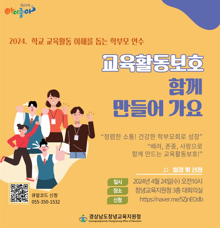 안내문(첨부파일 참조) 안녕하십니까? 아이들의 행복한 학교! 올바른 학교생활 이해로부터 출발합니다. 교권 보호 이해와 교육공동체 상호존중 문화 만들기에 우리가 모두 함께했으면 합니다. “교육활동 보호! 우리 함께 만들어 가요” 학부모 연수에 많은 참여 바랍니다.  ? 신청방법: https://naver.me/5ZjnEOdb, 유선문의: 350-1532(밀양거점학부모지원센터) ? 신청기간: 2024. 4. 8. ~ 4.19.까지 길 곡 초 등 학 교 장
