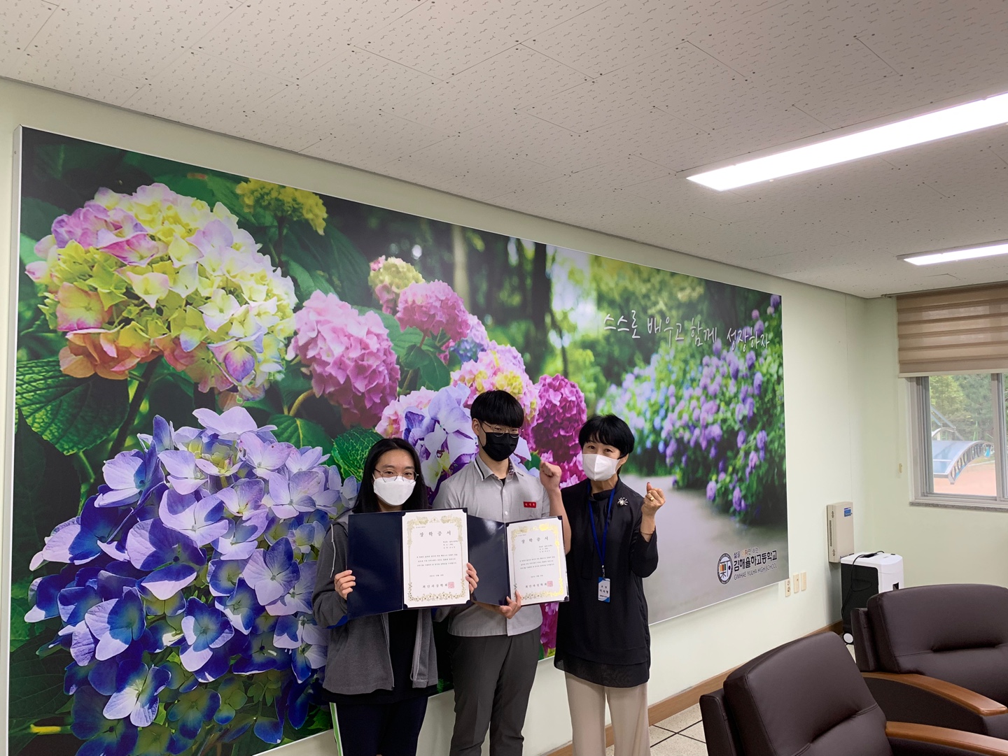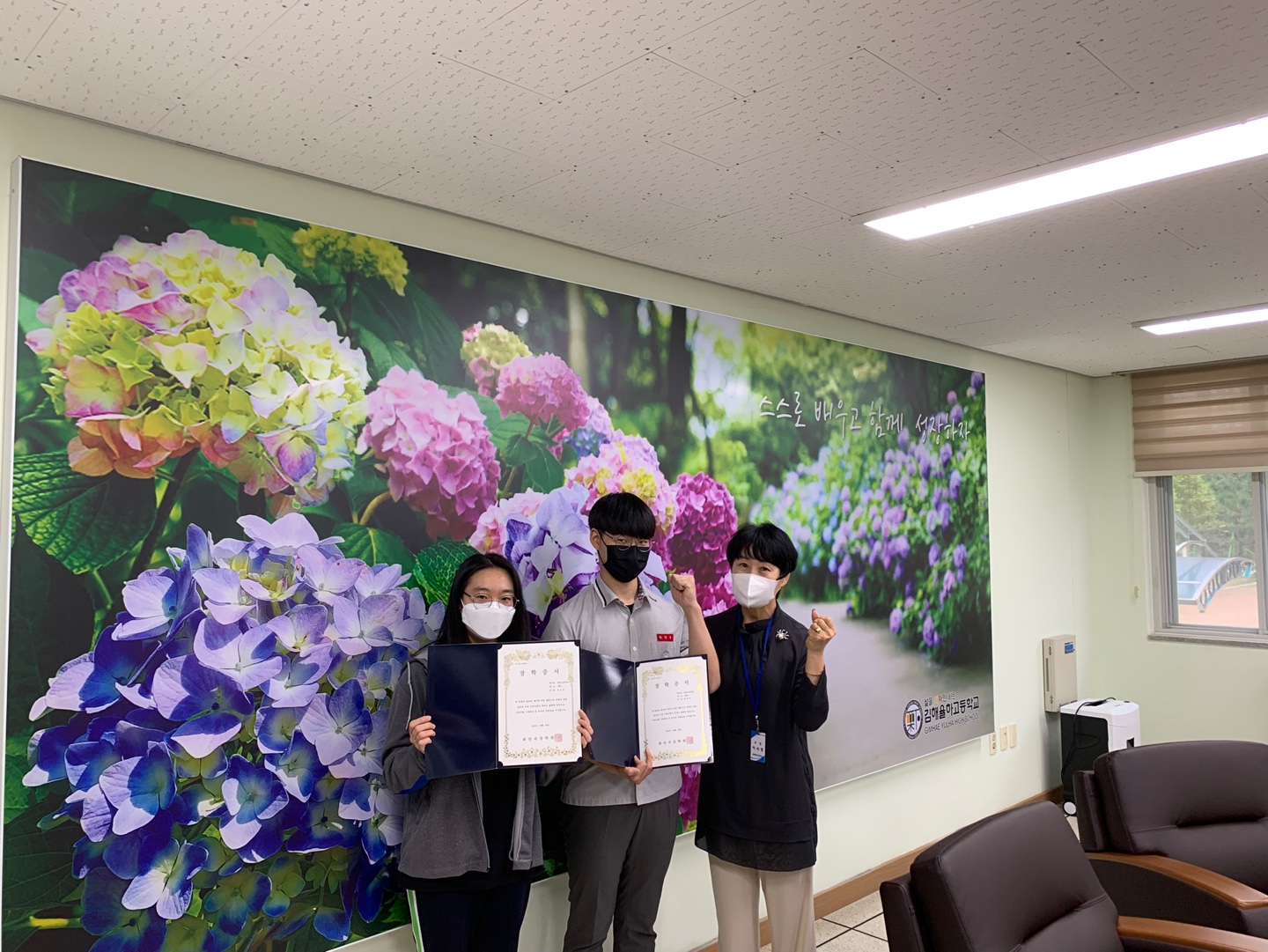1학년 김소연 학생과 2학년 박연우학생이 최안과 장학생으로 선발되어 장학금을 전달하게 되었습니다.