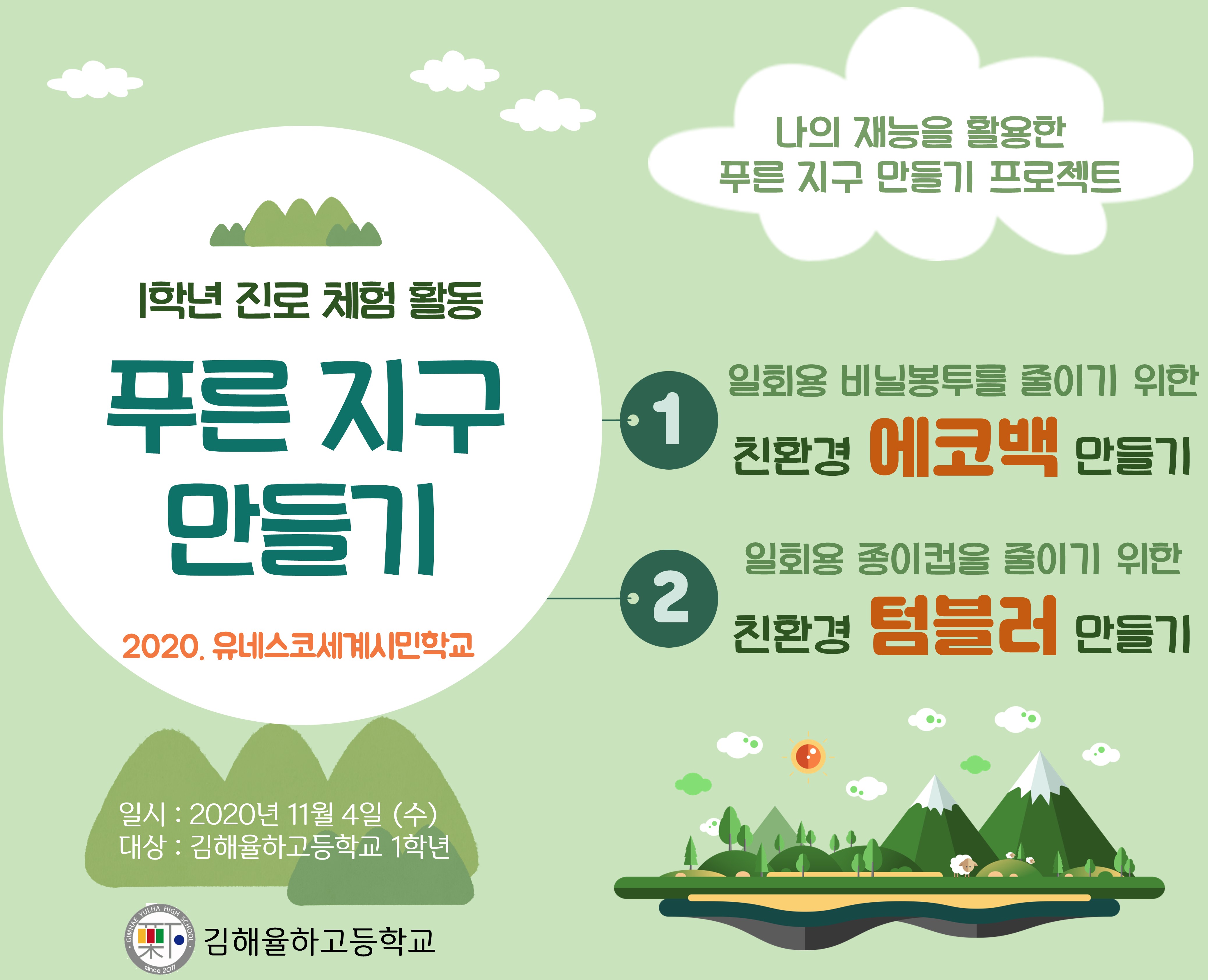 일회용 종이컵을 만들기 위해 지구에서 해마다 많은 나무들이 없어지고 있으며 이로 인해 지구온난화, 사막화, 야생동물 서식지 파괴 등 많은 문제점들이 나타나고 있다. 일회용컵 사용을 줄이기 위하여 교사와 학생들이 직접 디자인하여 제작한 친환경 텀블러를 교직원 및 전교생에게 나눔 행사를 진행하였다. 텀블러를 사용함으로써 일회용 컵 사용량을 줄일 수 있게 되었으며, 우리의 작은 실천이 환경보호에 도움이 되기를 기대한다.