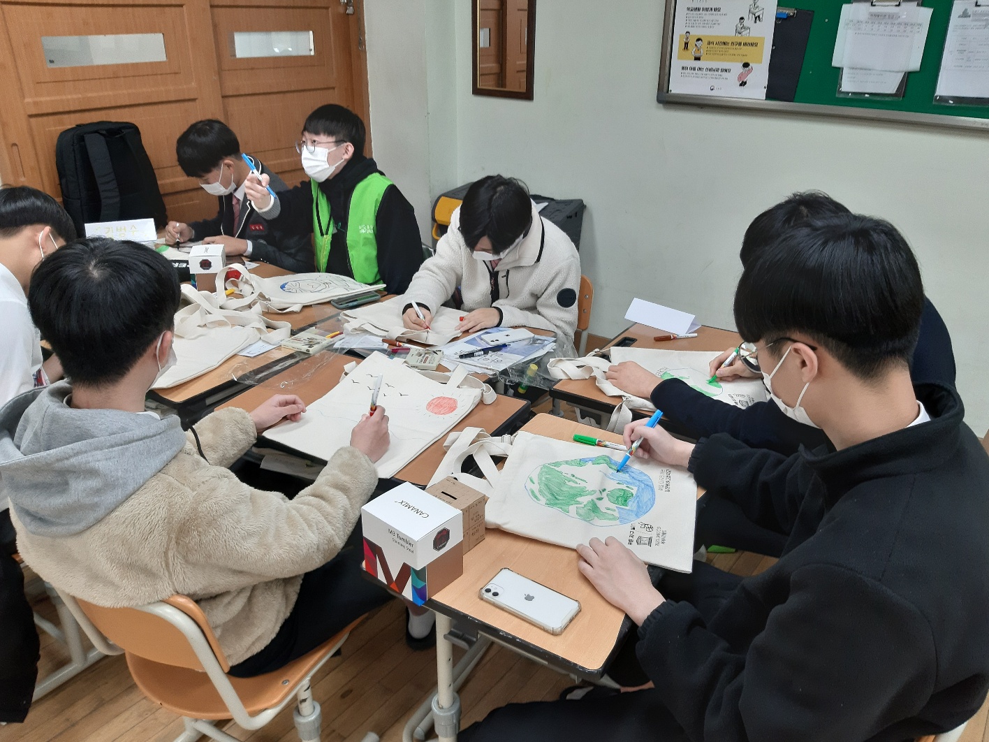 페브릭 마카를 활용하여 에코백을 직접 만들어보면서 우리가 환경을 위해 할 수 있는 작은 실천이 환경 보호에 어떤 영향을 미치는지 생각해보는 시간을 가졌다.