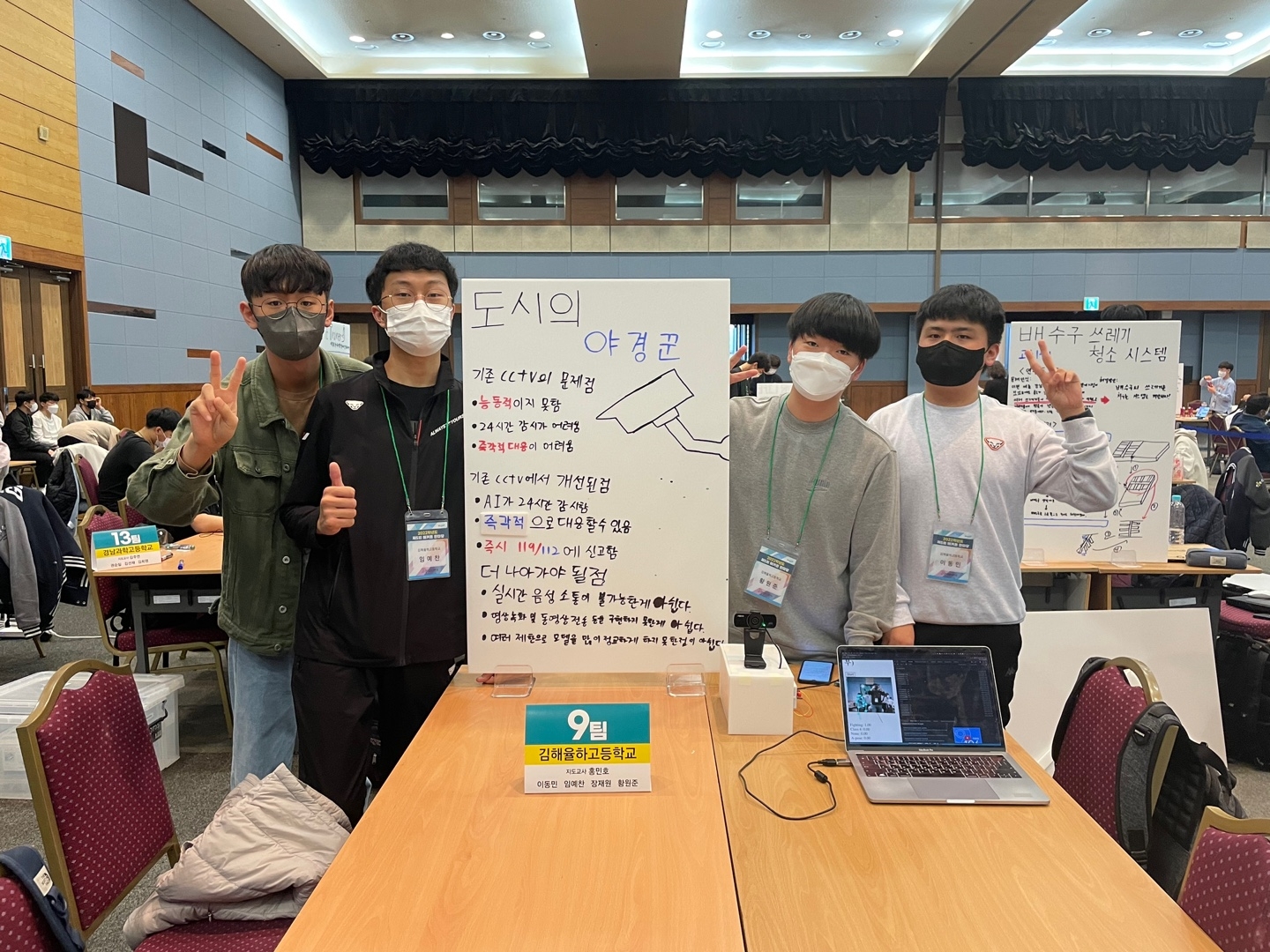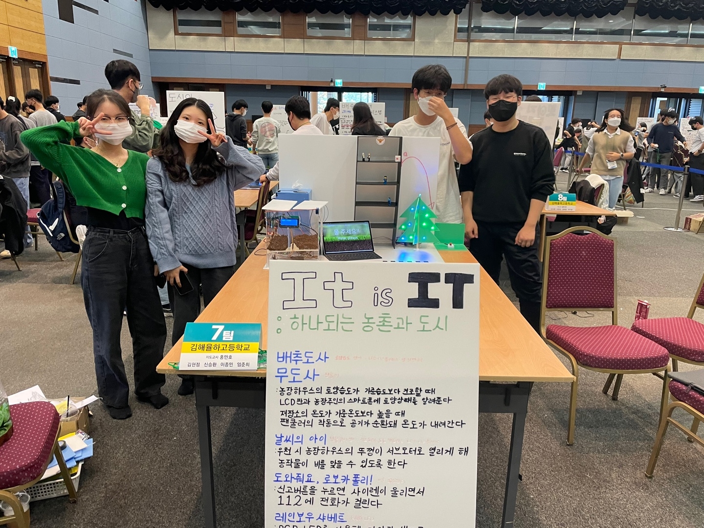 1. 행사명 : 제5회 해커톤 한마당(도교육청 주관) 2. 일시 : 2022. 10. 15. ~ 16. (무박 2일) 3. 장소 : 창원컨벤션센터 4. 대주제 : 국가 지속 가능한 발전 목표(하위 지표 중 선택) 5. 참가팀 및 소주제 가. It is IT(7팀) : 하나되는 농촌과 도시 나. 하이픈(8팀) : 보이지 않는 도우미 다. 오버플로우(9팀) : 도시의 야경꾼