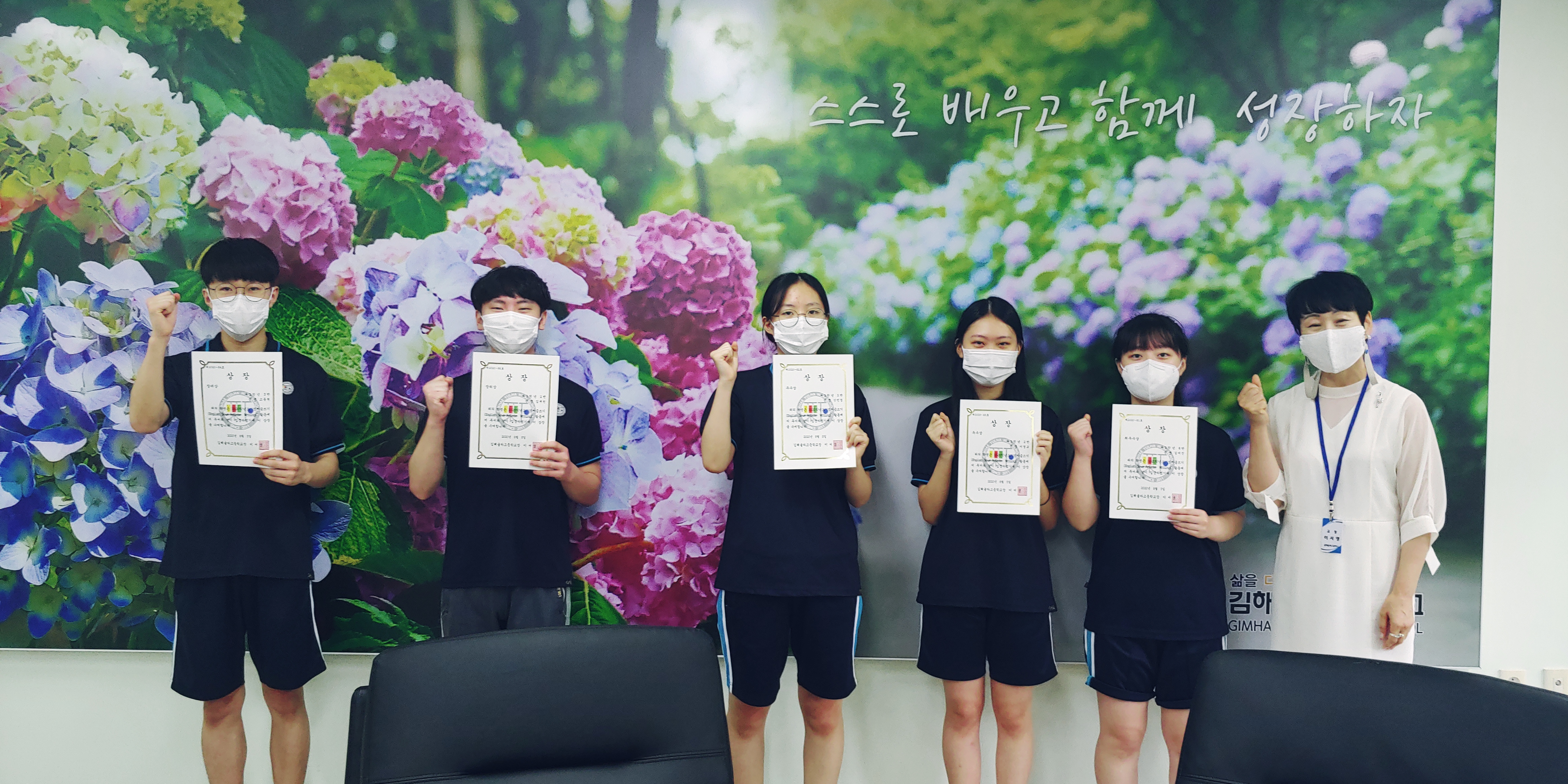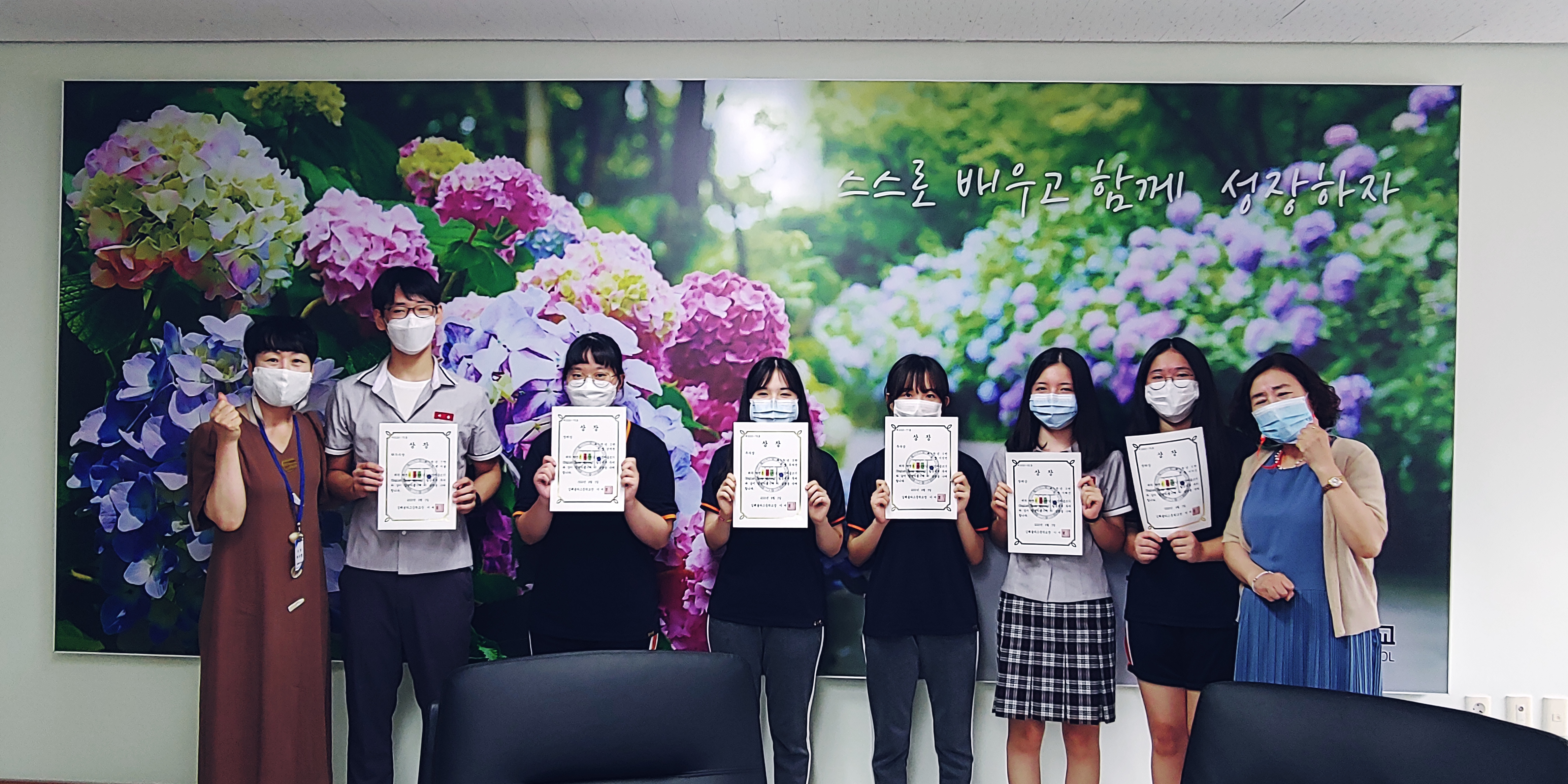 교내에서 실시한 2020학년도 영어글쓰기 행사에서 <영어 에세이쓰기> 대회에서는 1학년 지*(최우수), 유*연(우수), 이*빈(우수), 남*원(장려), 이*진(장려), 이*진(장려) 학생이 입상하였고, <영어 뉴스기사쓰기> 대회에서는 2학년 김*진(최우수), 강*경(우수), 이*교(우수), 고*현(장려), 장*서(장려), 김*원(장려) 학생이 입상하였습니다.