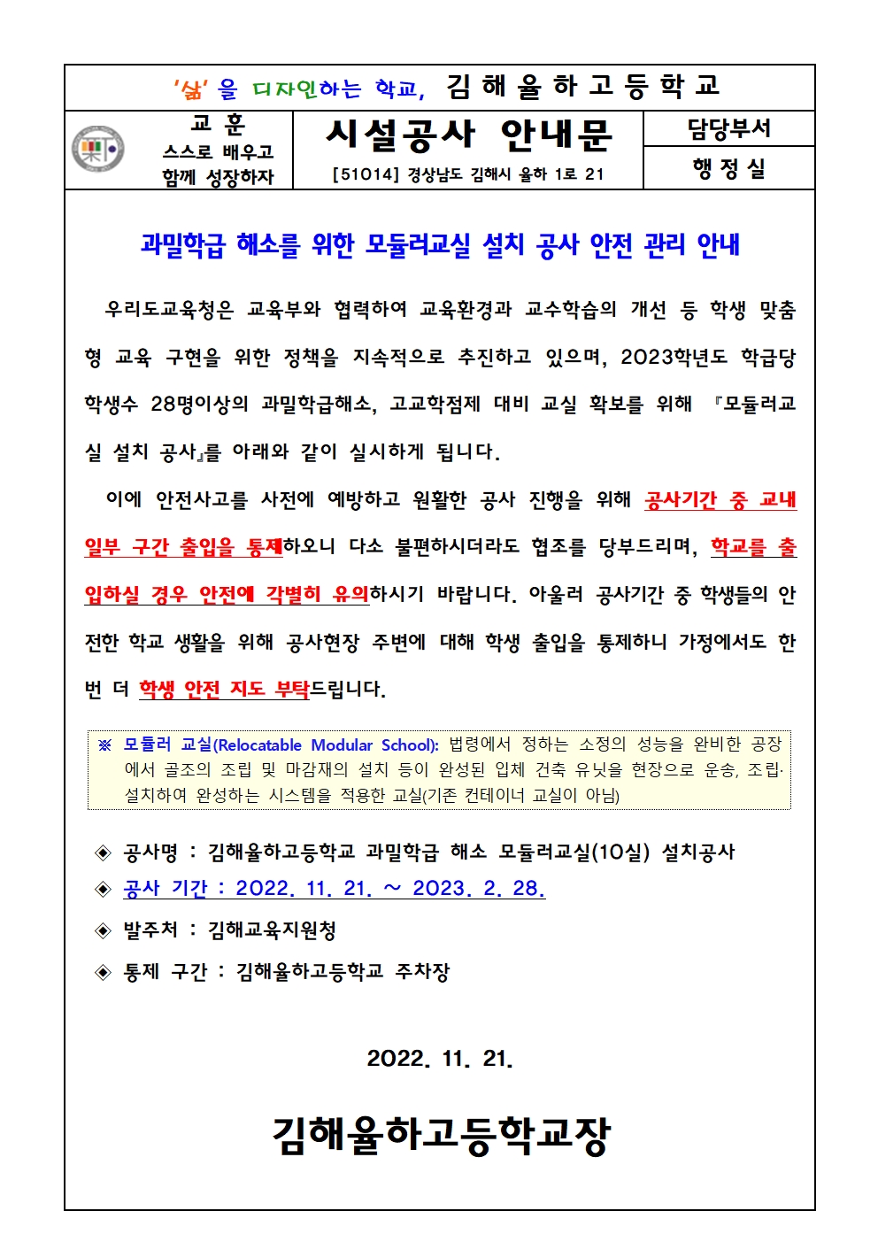 과밀학급 해소를 위한 모듈러교실 설치 공사 안내 및 안전관리 협조문