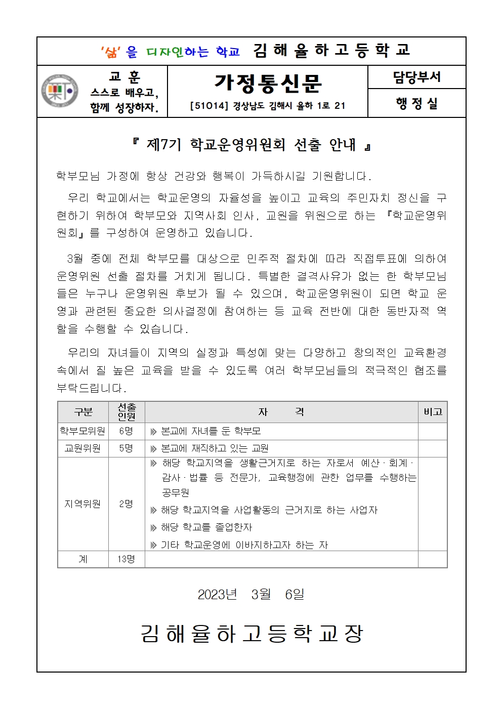 제7기 학교운영위원회 학부모위원 선출 홍보