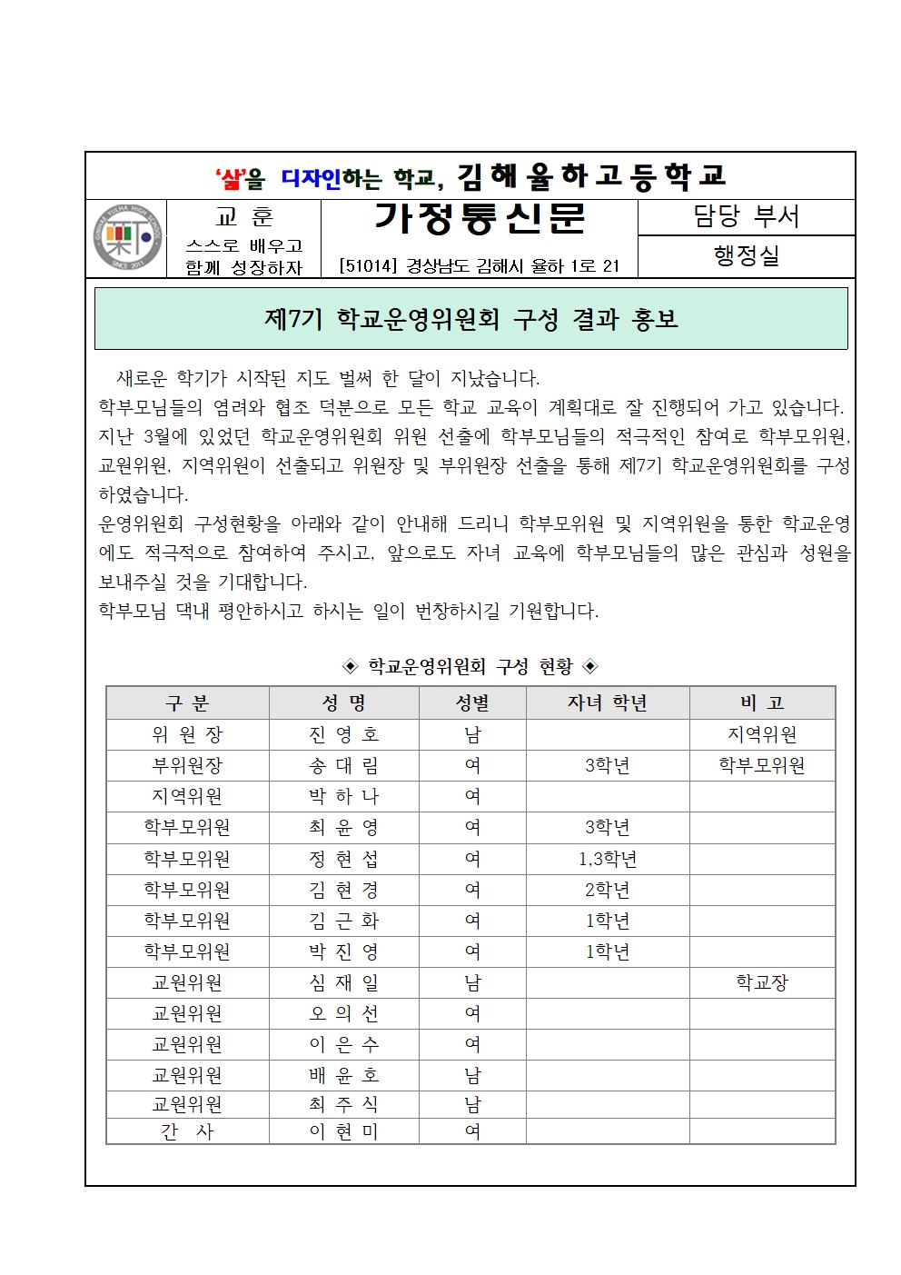 제7기 학교운영위원회 구성 결과 홍보