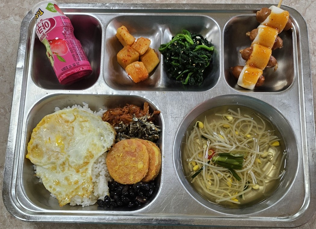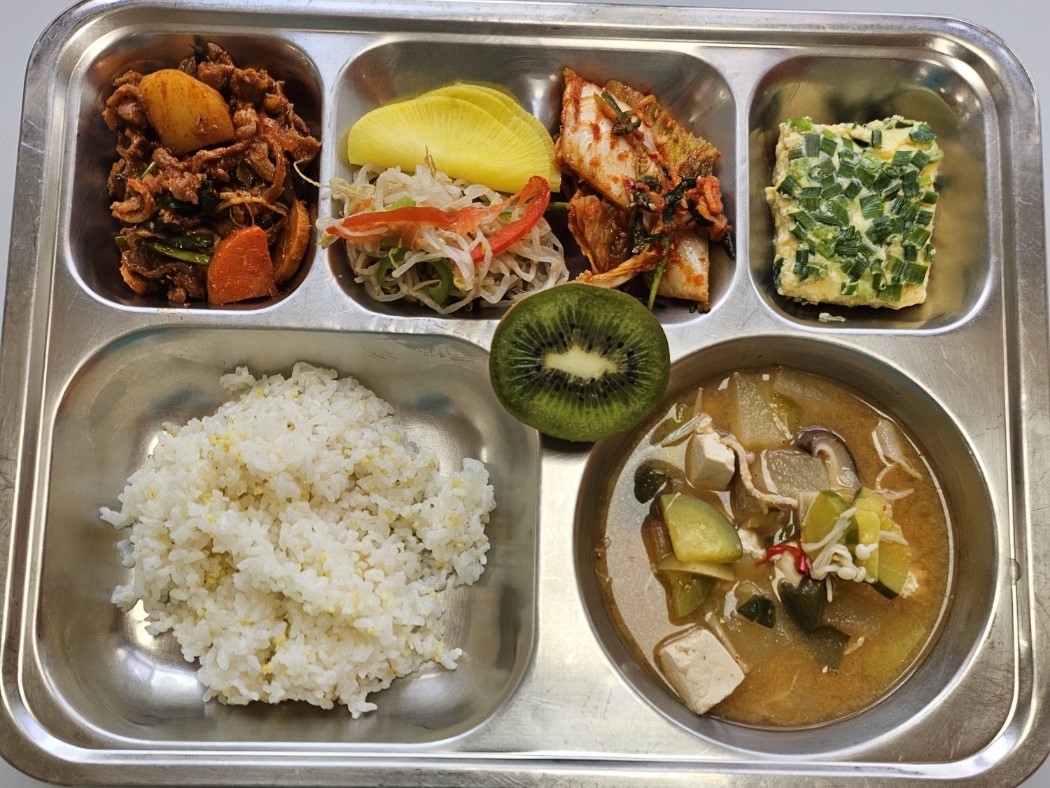 MON(4월 28일) | 친환경쌀기장밥(고) 돈차돌된장찌개(고)(5.6.10.18) 두부계란찜(저염)(고)(1.5.6) 숙주피망무침(고)(5.6) 오리불고기(고)(5.6.13) 배추김치(고)(9) 키위(고-자율) * 에너지/단백질/칼슘/철 1,105.4/46.1/245.3/7.0 | 옛날도시락종합세트(고)(1.2.5.6.9.10.12.15.16)콩나물맑은국(고)(5) 시금치나물(고-자율) 깍두기(고)(9) *나!소시지를품은떡(고)(5.10.15) (납작복숭아)요쿠르트(고)(2) * 에너지/단백질/칼슘/철 698.2/33.0/316.6/3.4 |
