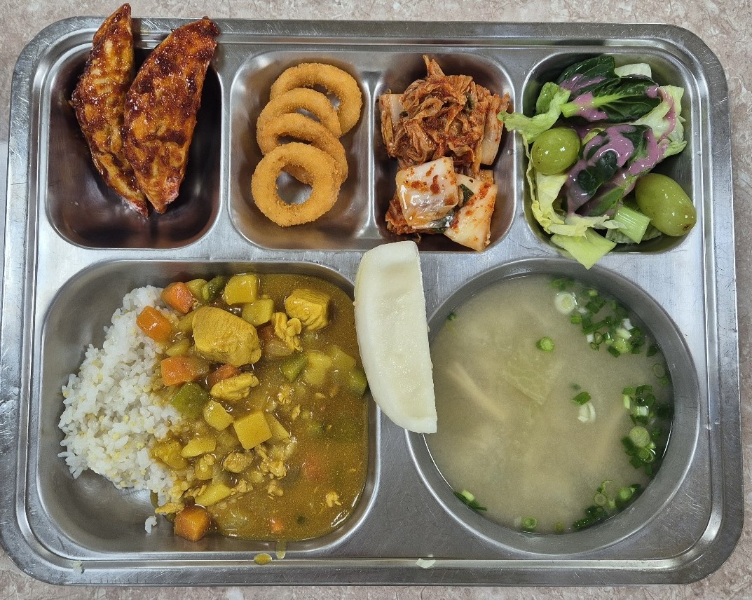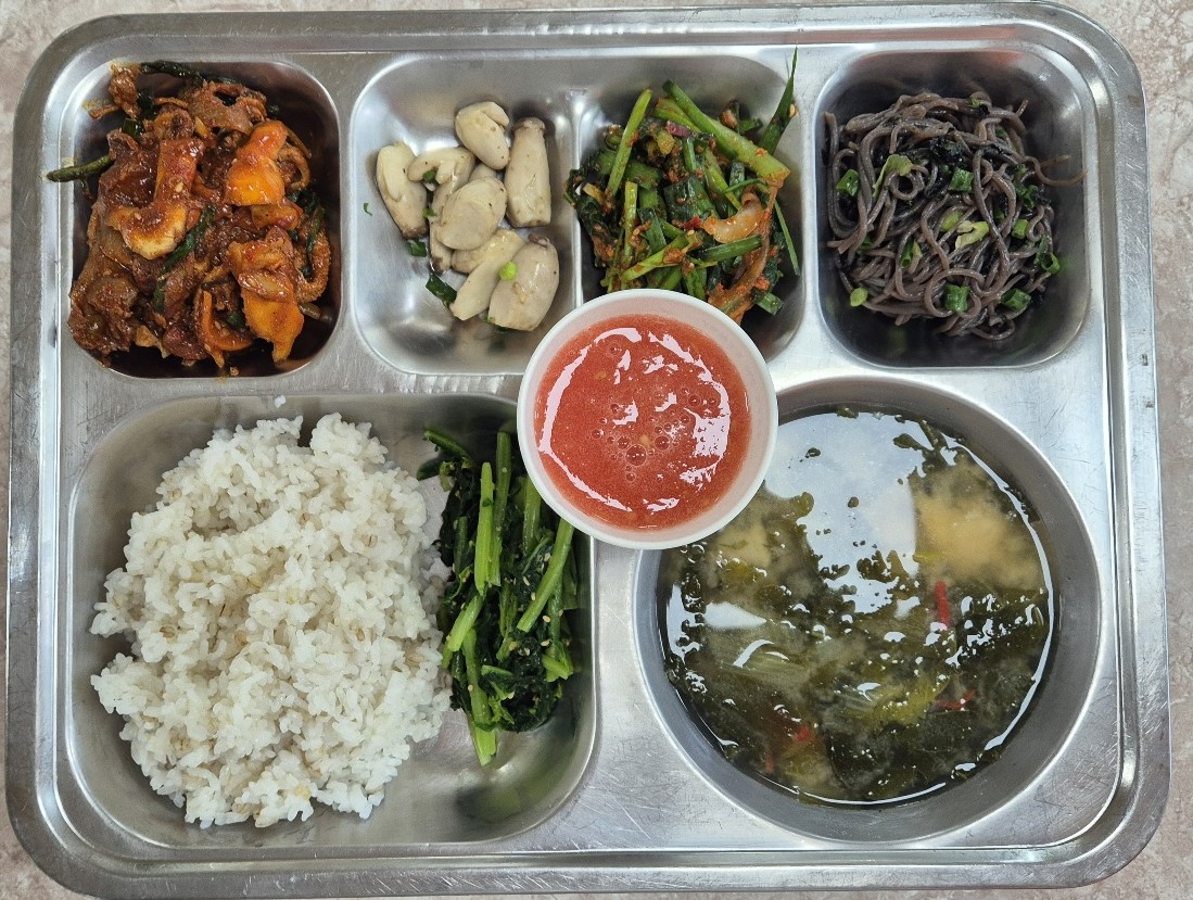 FRI(5월 9일) | 친환경쌀보리밥(고) 시락국(고)(5.6.9.18) (적은)들기름막국수(고)(3.5.6.13) 애새송이버섯허브구이(저염)(고) 열무(산초)겉절이(고-자율)(13) 오리불고기(고)(5.6.13) *수제토마토쥬스(고)(12) * 에너지/단백질/칼슘/철 1,005.8/36.3/261.3/5.8 | 닭가슴살마크니커리덮밥(고)(2.5.6.10.12.13.15.16.18) 미소된장국(고)(5.6) 양상추청포도샐러드(고)(1.2.5.6.13) *이북식만두범벅(고)(1.2.5.6.13) 양파~링(고)(5) 배추김치(고)(9) 참외(고) * 에너지/단백질/칼슘/철 890.4/29.7/174.1/2.8 |