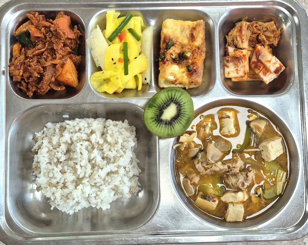 MON(6월 23일) | 친환경쌀보리밥(고) 돈차돌된장찌개(고)(5.6.10.18) 두부계란구이(저염)(고)(1.5.6) 쌈무배무침(고)(13) 오리불고기(고)(5.6.13) 배추김치(고)(9) 참다래(고-자율) * 에너지/단백질/칼슘/철 1,072.9/44.9/247.2/6.6 | 볶음김치(고)(9.13) 친환경쌀백미밥(고) 굴림만두국(고)(1.5.6.10.16.18) 열무나물무침(고)(5.6) *별별*속초식닭야채계란말이강정(고)(4.13.15) 새우칩(고)(6) * 에너지/단백질/칼슘/철 719.7/42.6/292.5/5.1 |