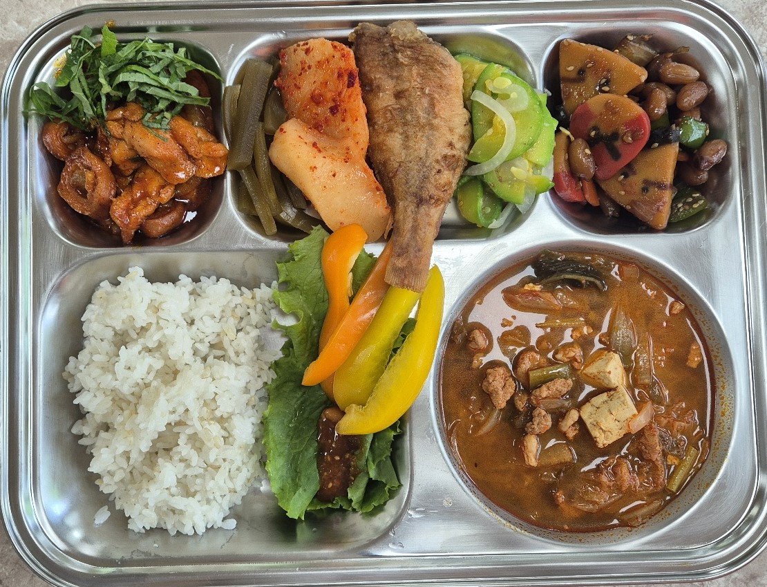 (중식) 친환경찰현미밥(고) 돈육김치찌개(고)(2.5.6.9.10.13) 불막창닭어깨살볶음(고)(2.5.6.10.13.16) 애호박새우젓볶음(고-자율)(9) 완자어묵땅콩조림(고)(1.4.5.6.13) 상추&파프리카/쌈장(고-자율)(5.6.13) 볼락구이(고-자율) 석박지(고)(9) * 에너지/단백질/칼슘/철 830.5/46.5/335.7/4.9