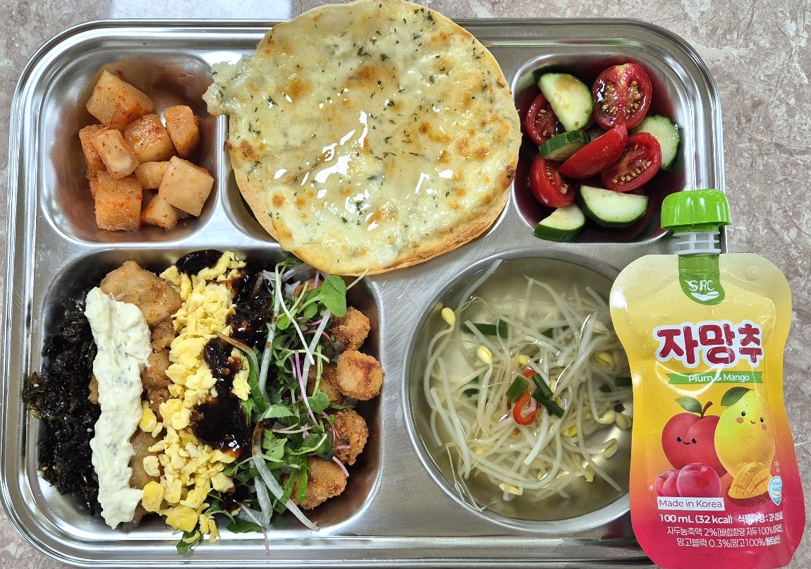 (석식) 치팸샐러드마요덮밥(고)(1.5.6.10.13.15.16.18) 콩나물맑은국(고)(5) 토마토오이샐러드(고)(1.2.5.6.12.13) 깍두기(고)(9) *수제고르곤졸라피자(고)(2.5.6.13) 깍두기(고)(9) 자망추쥬스(고) * 에너지/단백질/칼슘/철 1,467.5/81.2/192.6/6.
