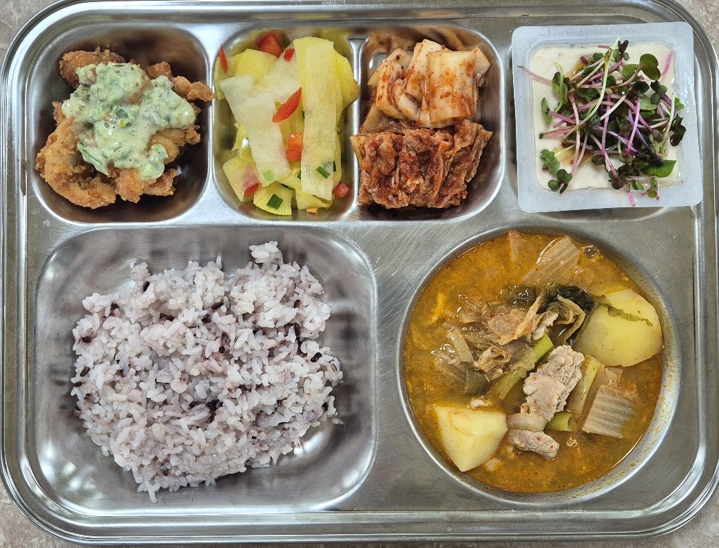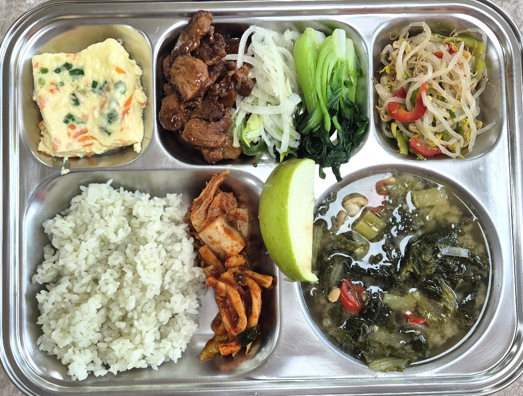 (중식) 녹차카테킨친환경쌀밥(고) 들깨시락국(고)(5.6.18) 콘치즈달걀찜(고)(1.2) 숙주피망무침(고-자율)(5.6) 동파육&청경채찜(고)(5.6.10.13) 무말랭이고추잎지(고) 배추김치(고)(9) 사과(고-자율) * 에너지/단백질/칼슘/철 656.0/45.9/223.3/3.2 (석식) 찰흑미밥(고) 김치순살감자탕(고)(2.5.6.8.9.10.18) 쌈무배무침(고)(13) 연두부샐러드(고)(5.6.8.9.13.15.17.18) 고추마요치킨(고)(13.15) 배추김치(고)(9) * 에너지/단백질/칼슘/철 762.4/48.3/130.4/3.1
