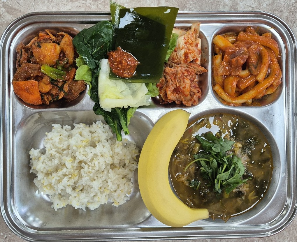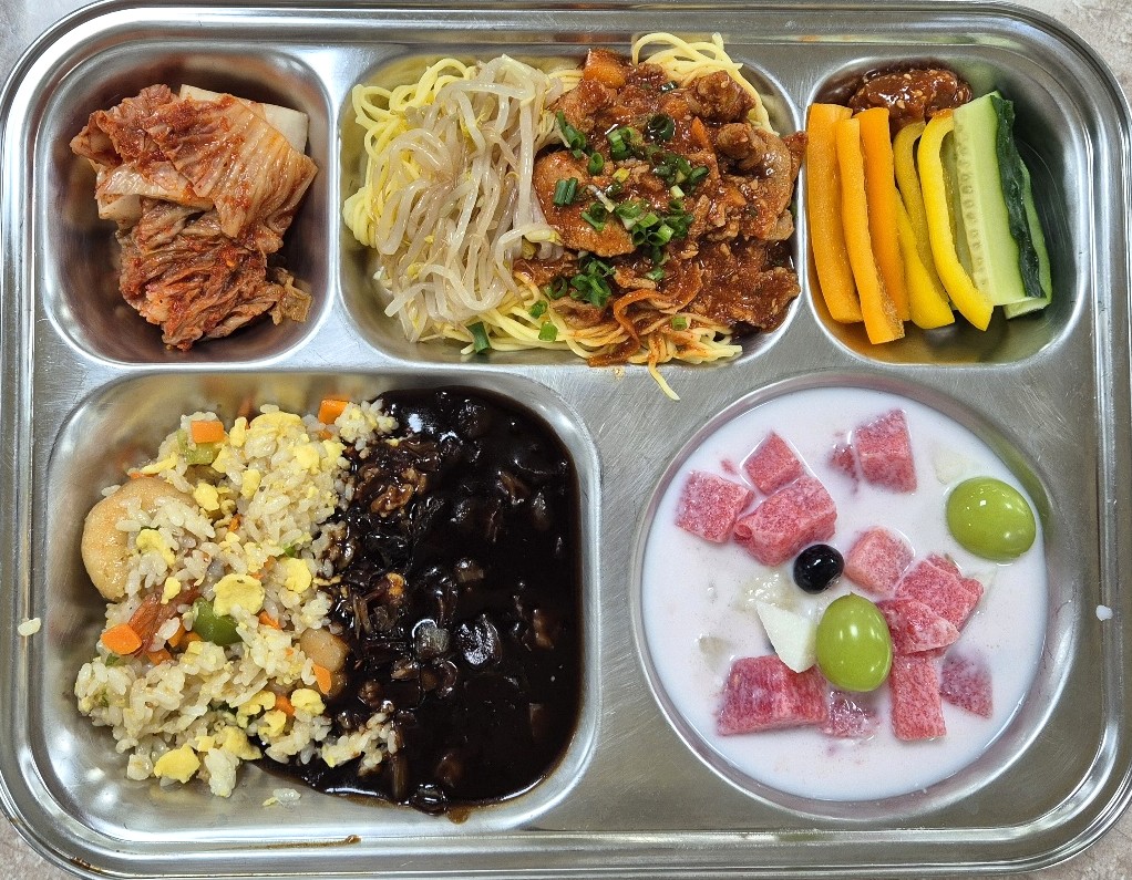 FRI(9월 12일) | 친환경쌀기장밥(고) 로제떡볶이(고)(2.5.6.10.12.13) 추어탕(고)(5.6) 모듬숙쌈&상추(고-자율)(5.6) 오리불고기(고)(5.6.13) 배추김치(고)(9) 바나나 반개(고) * 에너지/단백질/칼슘/철 1,025.8/37.2/362.6/6.7 | 상하이볶음밥&자장소스(고)(1.5.6.9.13.16.18) 불고기차오멘(고)(1.2.5.6.13.16.18) 배추김치(고)13 수박화채(고)(2.13) *자율-오이,파프리카스틱(고)(5.6.13) * 에너지/단백질/칼슘/철 1,274.3/46.9/426.5/5.7 |