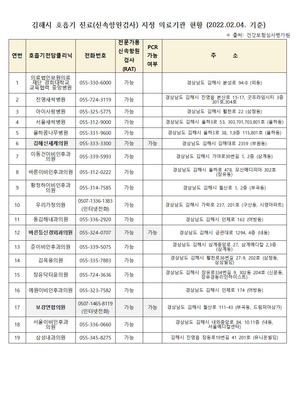 김해시 호흡기진료(신속항원검사) 지정 의료기관 현황