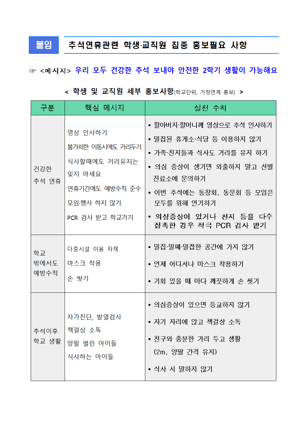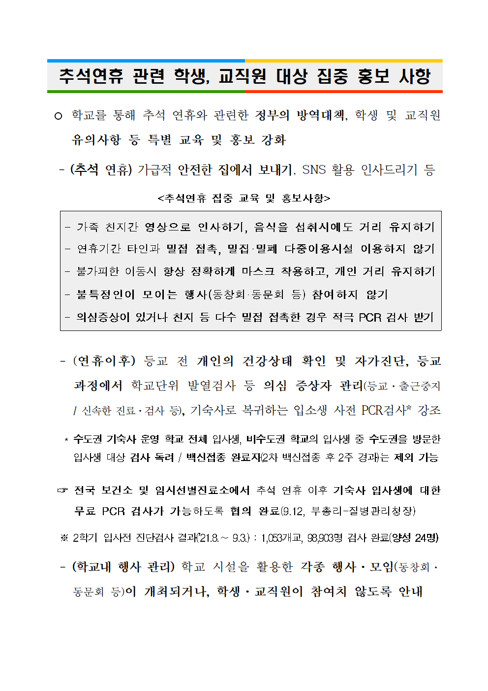 추석연휴 관련 학생 및 교직원 대상 집중 홍보사항