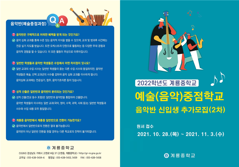 2. 모집 절차 가. 원서 교부 및 접수 1) 기간 : 2021. 10. 28.(목) 09:00 ~ 2021. 11. 3.(수) 16:00까지 ※ 계룡중학교 홈페이지에서 배정 원서를 출력하여 접수처로 우편 및 방문 제출(우편접수는 마감시간 소인까지 유효) 2) 접수처 : 경상남도 거제시 고현로 14길 37, 계룡중학교 [예술(음악)중점학교 담당자]