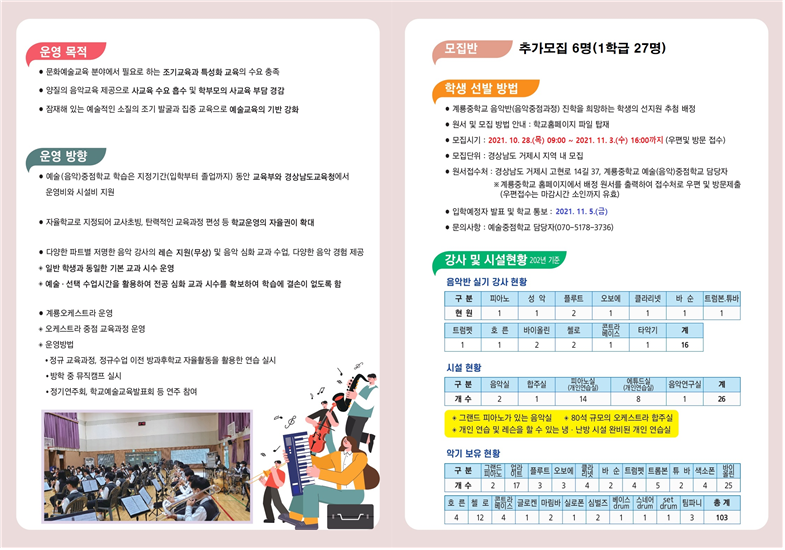 1. 모집 계획 □ 모집 대상 : 거제시 지역 초등학교 졸업예정자 및 초등학교 졸업자 중 거제시에 거주하는 자 □ 모집 방법 : 모집대상자 중 계룡중학교 음악반(예술중점과정) 진학을 희망하는 학생으로부터 선지원을 받아 추첨 배정함 □ 모집 인원 : 1학년(신입생) 1학급(남·여 구분 없이 총27명) □ 추가 모집 : 6명
