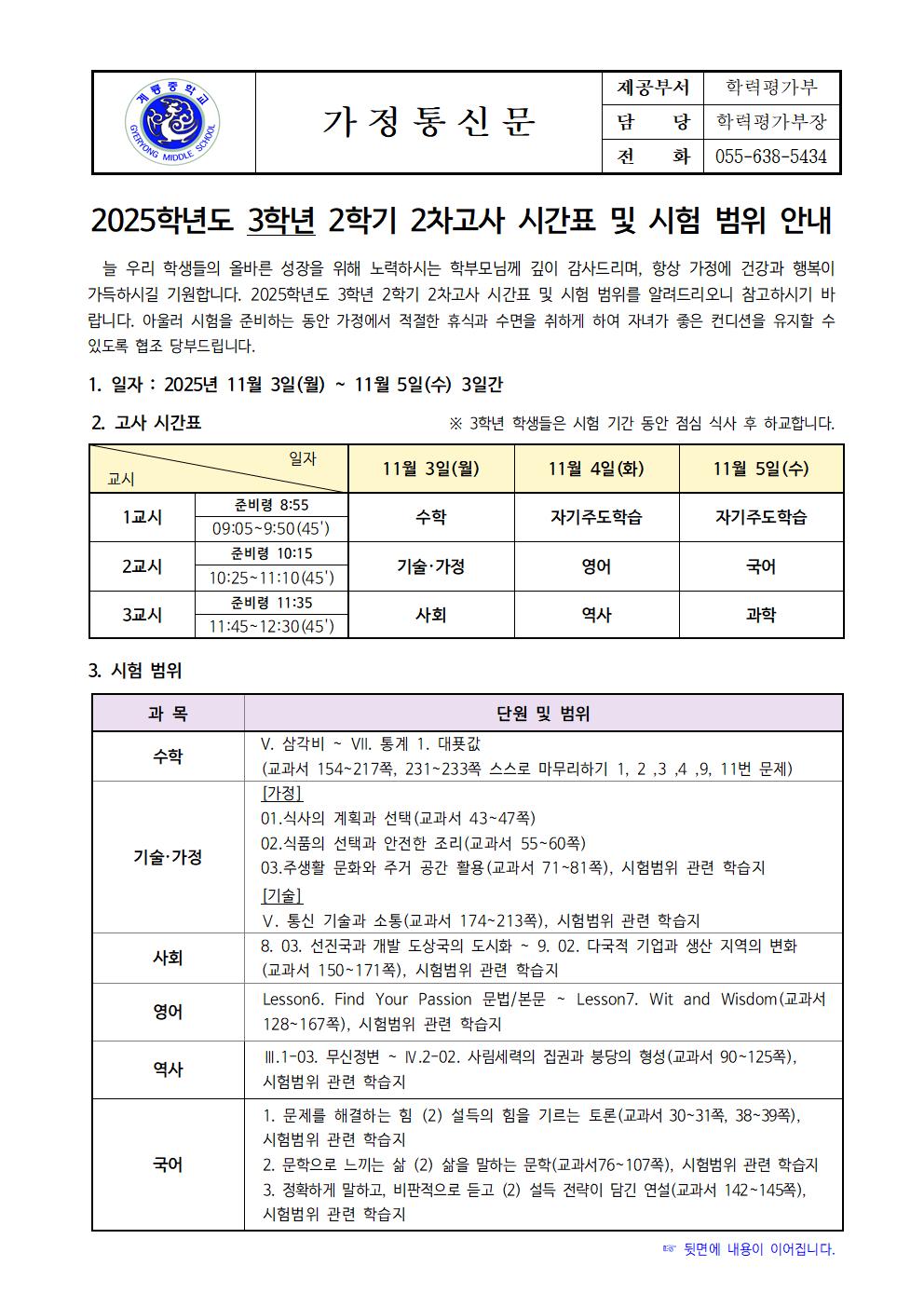 2025학년도 3학년 2학기 2차고사 안내 가정통신문입니다. 첨부파일을 열어 내용을 확인하여 주십시오.