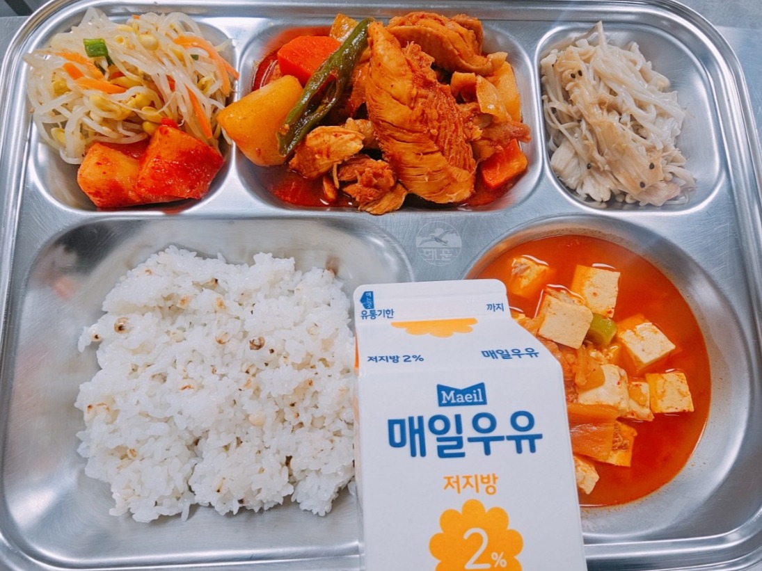 율무밥참치김치찌개(5.9.16.18)닭고기감자조림(5.6.13.15)콩나물무침(5)*팽이버섯참기름구이섞박지(9)저지방우유(2)*에너지/단백질/칼슘/철726.76/47.12/309.02/3.11