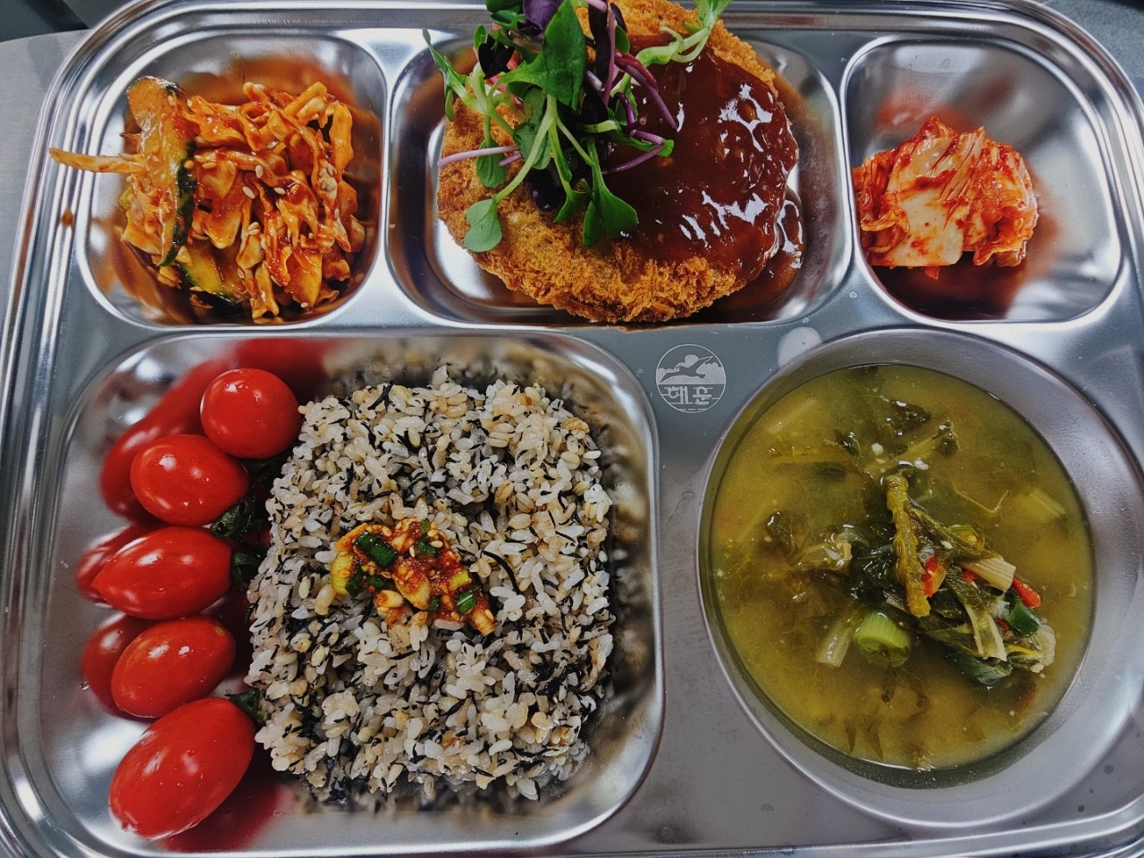 톳밥&양념장(5.6.13)무청된장국(5.6)양배추생채(5.6.13)순살돈까스&어린잎채소(1.5.6.10.12.13.18)배추김치(9)대추방울토마토(12)*자율밥*에너지/단백질/칼슘/철757.57/20.39/213.24/5.08
