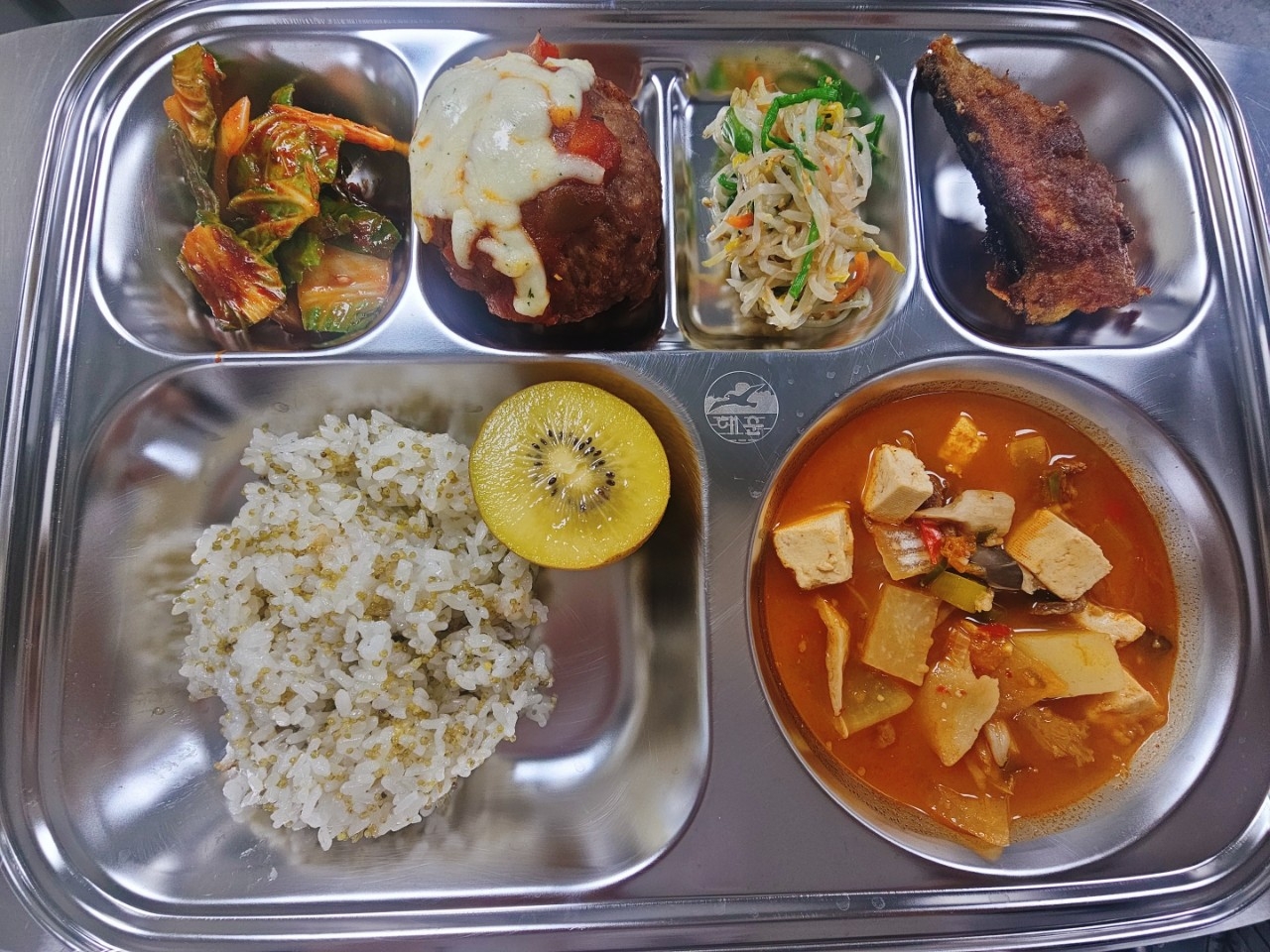 차조밥한우청국장찌개(5.6.9.16.18)숙주미나리무침(5.6)카레고등어구이(2.5.6.7.12.13.16.18)피자맛밤함박(1.2.5.6.10.12.15.16)골드키위봄동겉절이(5.6.13)*에너지/단백질/칼슘/철848.05/36.82/139.21/5.02