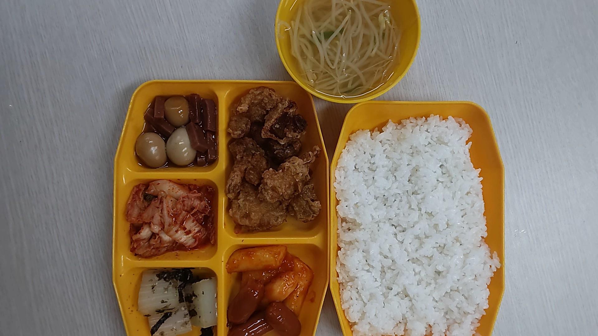 백미밥, 콩나물국. 교촌치킨,소떡소떡,청포묵무침.햄메추리알조림, 배추김치
