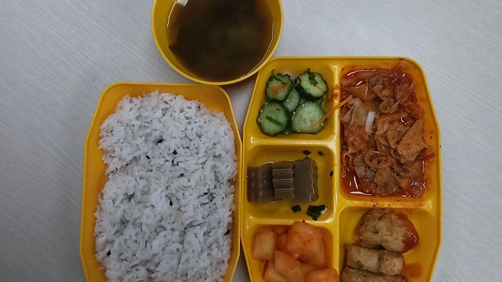 잡곡밥, 미역미소장국, 김치돈육볶음, 피쉬프랜즈, 오이부추무침, 도토리묵/양념장, 깍두기