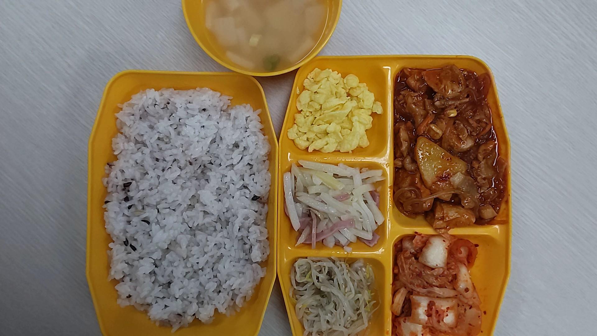 잡곡밥, 어묵국, 분모자마라찜닭, 숙주나물, 햄감자채볶음, 스크램블에그, 배추김치