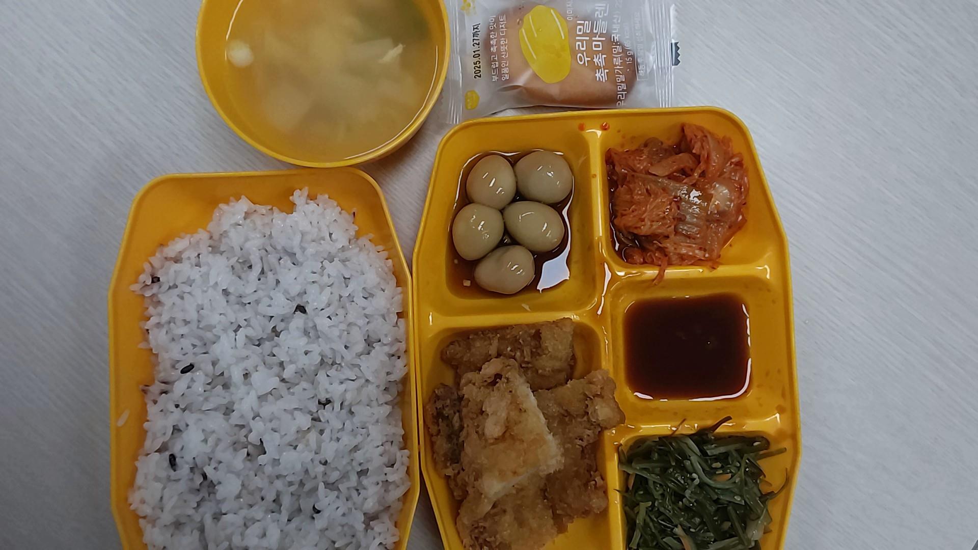 잡곡밥, 북어국, 등심돈까스/소스, 미역줄볶음, 메추링ㄹ조림, 배추김ㅂ치, 우리밀마들렌