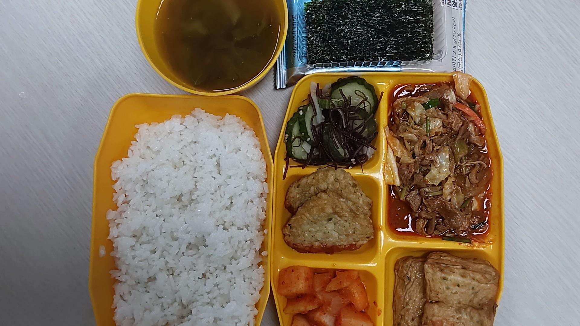 백미밥, 시락국, 오리불고기, 해쉬브라운, 꼬시래기오이생채, 어두부전, 깍두기, 도시락김