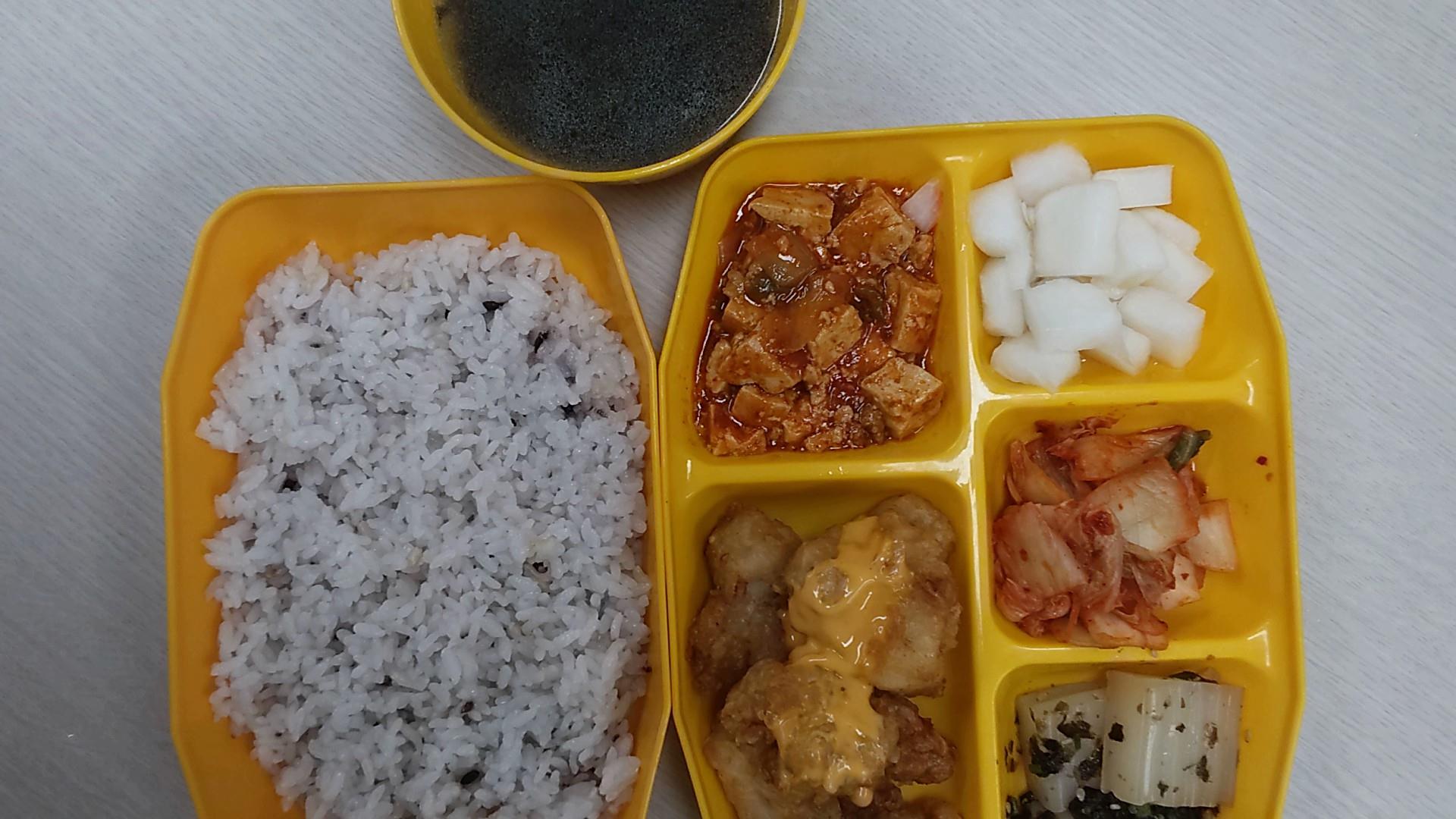 잡곡밥, 참치미역국, 치킨/스리라차마요소스, 청포묵무침,두부매콤조림, 치킨무, 배추김치
