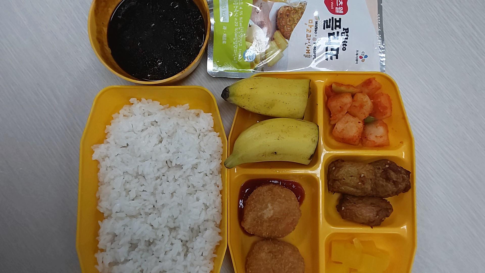 백미밥, 짜장덮밥소스, 김치치즈아란치니, 잡채어묵조림, 단무지, 과일, 깍두기, 플리또주스