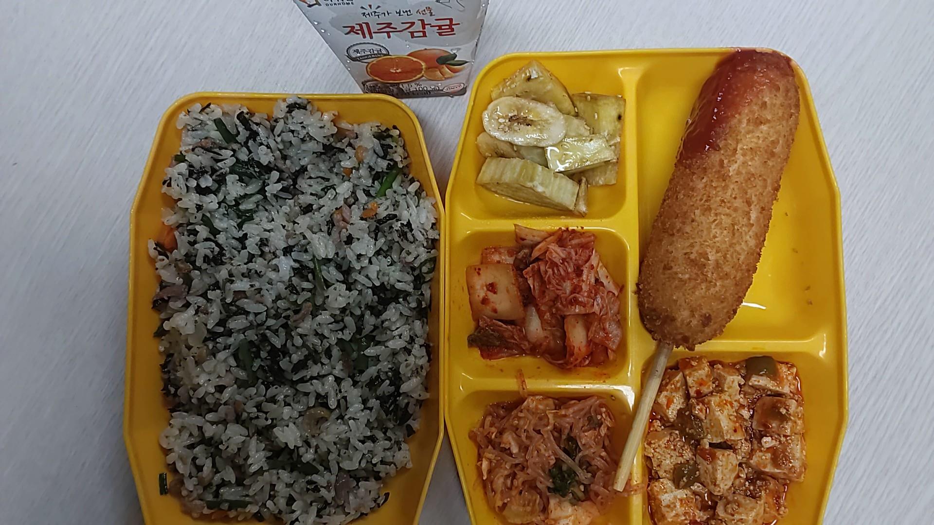 오리훈제볶음밥, 크리피스핫도그/케찹, 마파두부, 고구마바나나맛탕, 실곤약초무침, 배추김치, 제주감귤주스