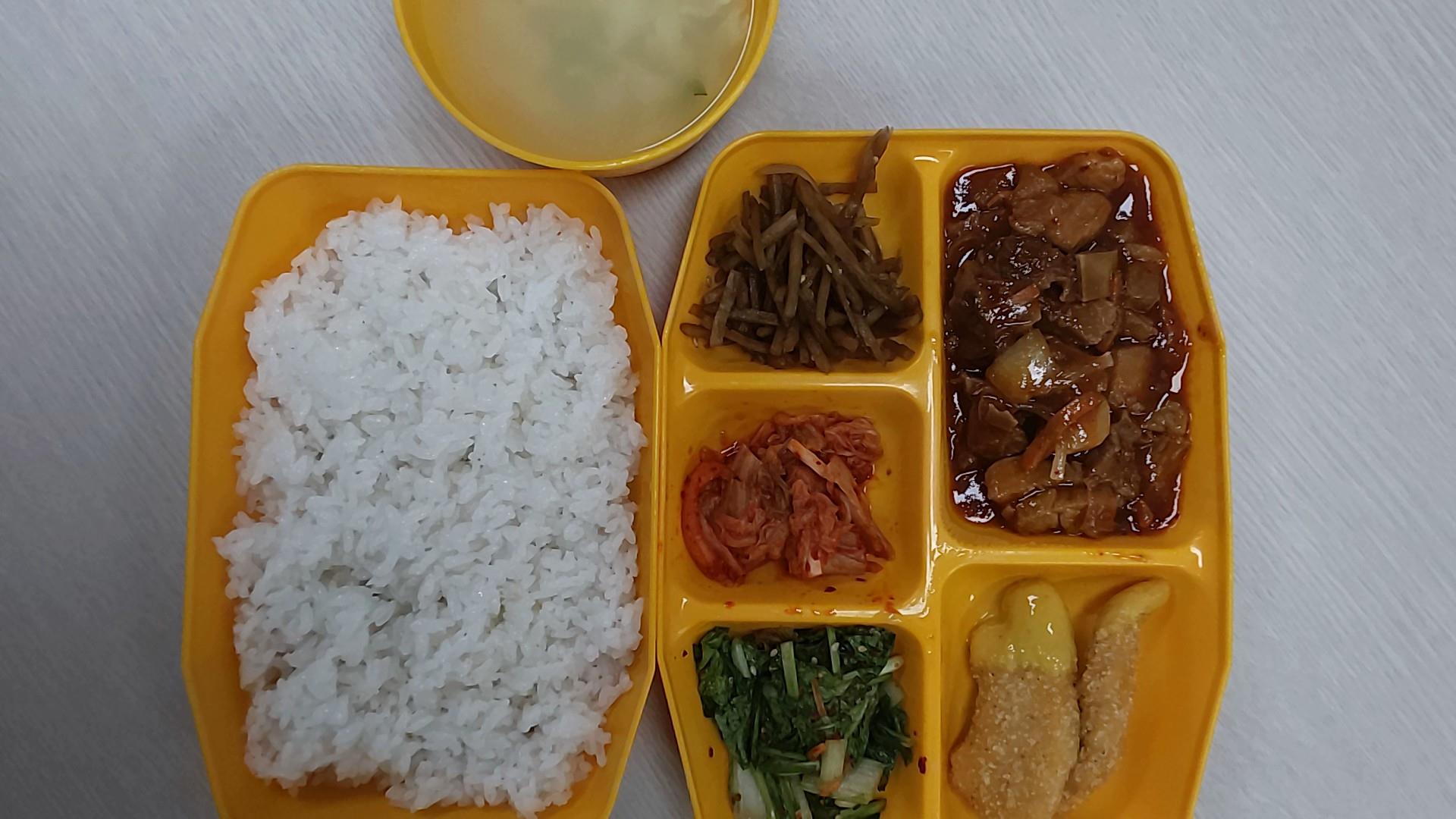 백미밥, 계란국, LA갈비찜, 우엉채조림, 용가리치킨너겟, 얼갈이겉절이, 배추김치