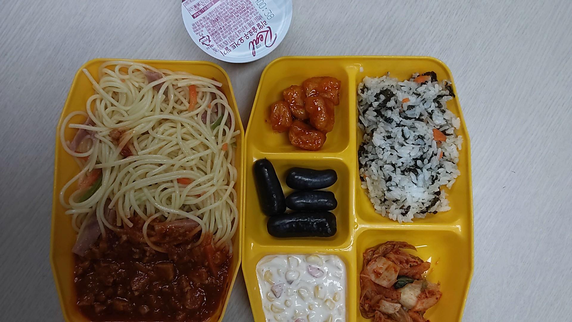 미트스파게티, 잔멸치주먹밥, 스위트콘샐러드, 팝콘치킨, 과일, 떠먹는요거르트