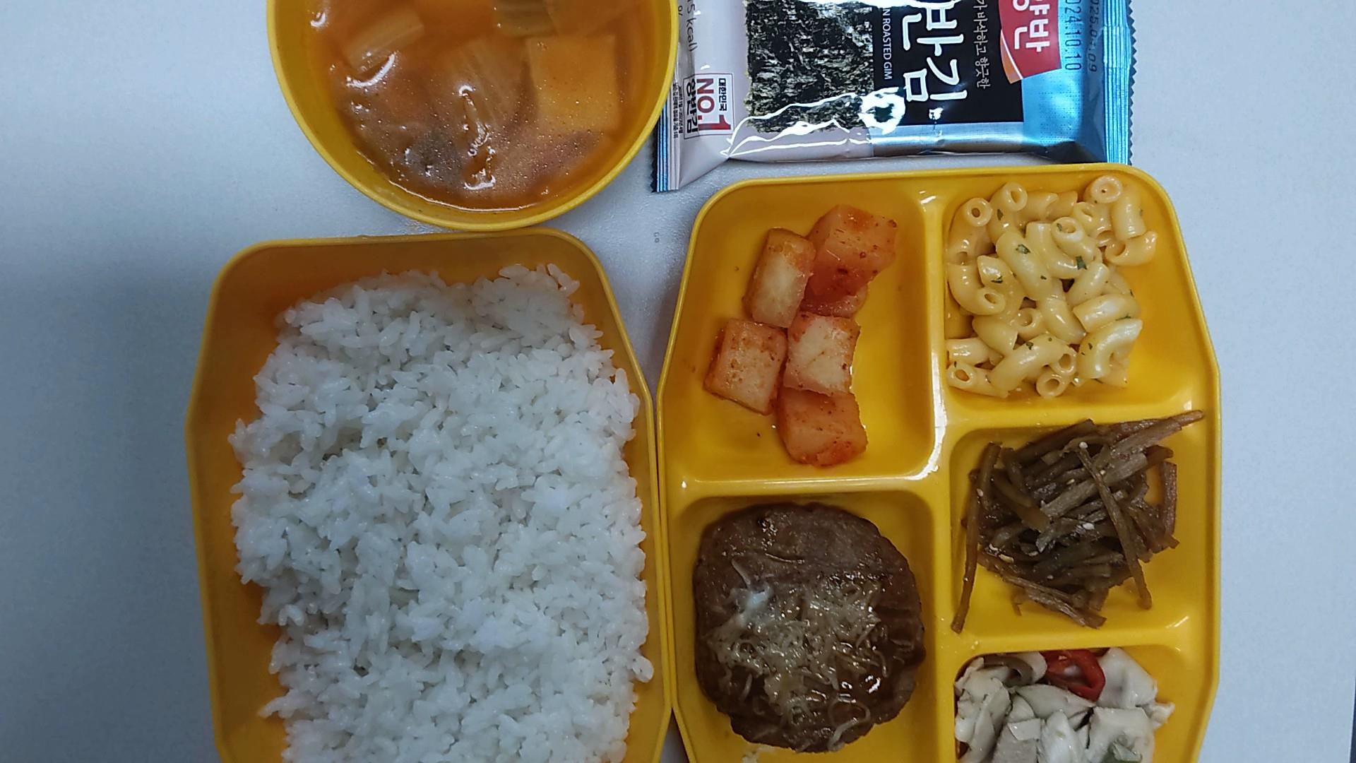 백미밥, 김치어묵국, 함박스테이크, 불닭맥앤치즈, 버섯야채볶음, 우엉채조림, 깍두기, 도시락김