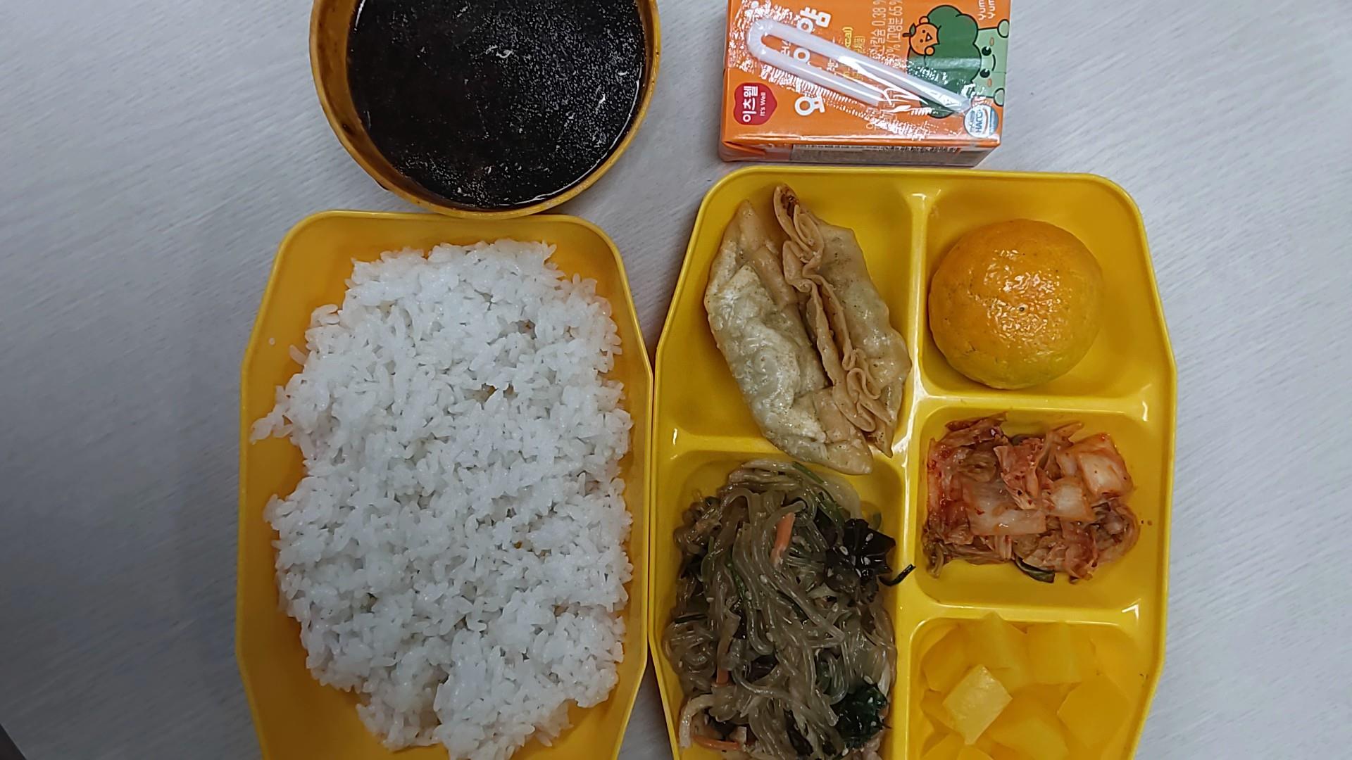 백미밥, 짜장덮밥소스, 한ㅅ힉잡채, 야끼만두, 깍둑단무지, 배추김치,과일,요거얌얌