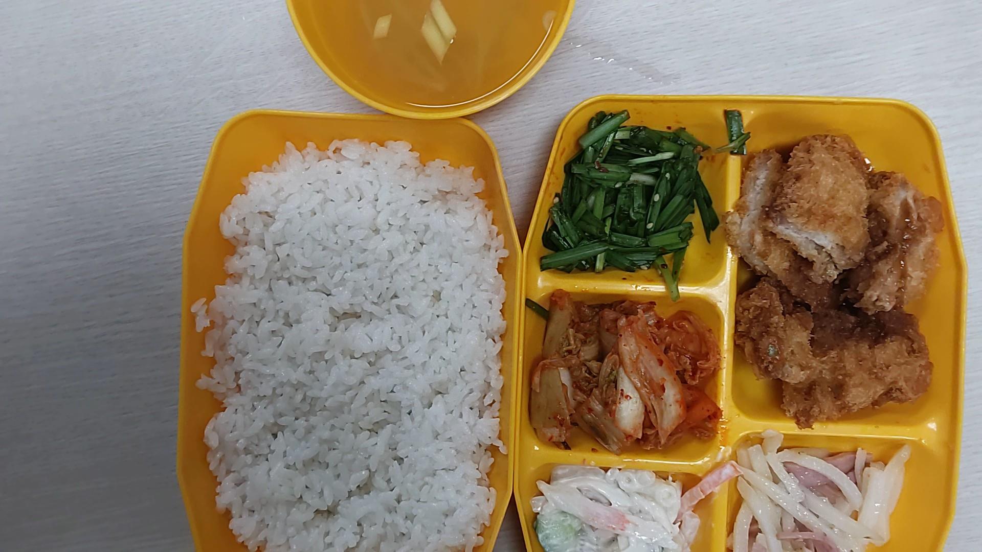 백미밥, 콩나물국, 등심돈까스&소스, 햄감자채볶음, 부추겉절이, 크레미곤액샐러드, 배추김치