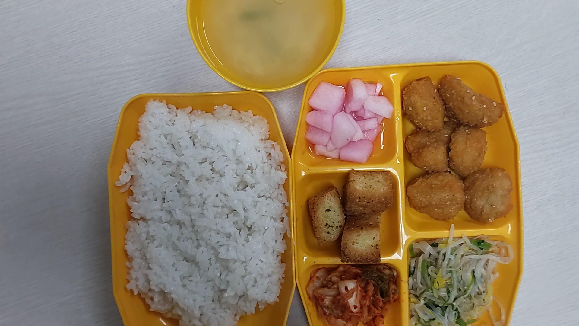 백미밥, 감자계란국, 교촌치킨, 비트무피클, 숙주미나리무침, 배추김치, 갈릭쁘띠바게트