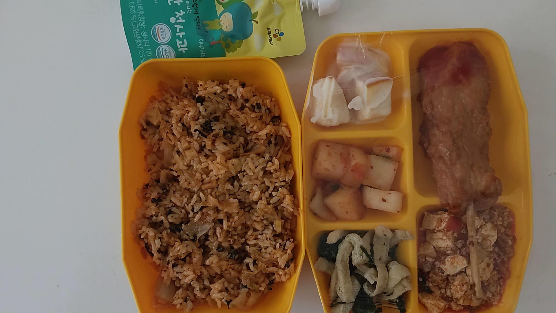 김치볶음밥, 오징어핫바/케찹, 마파두부, 시금치유부무침, 과일샐러드, 깍두가,플리또주스